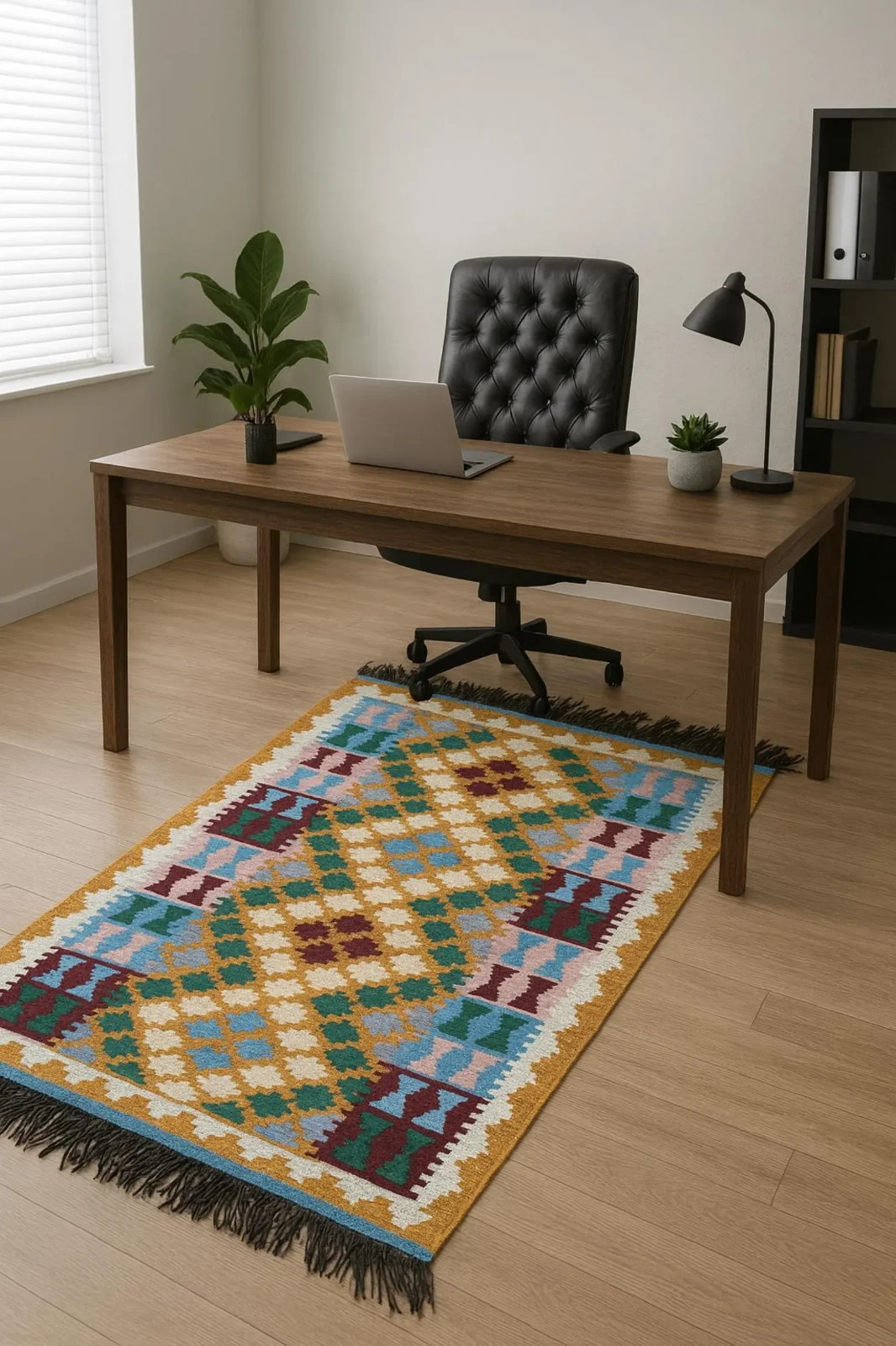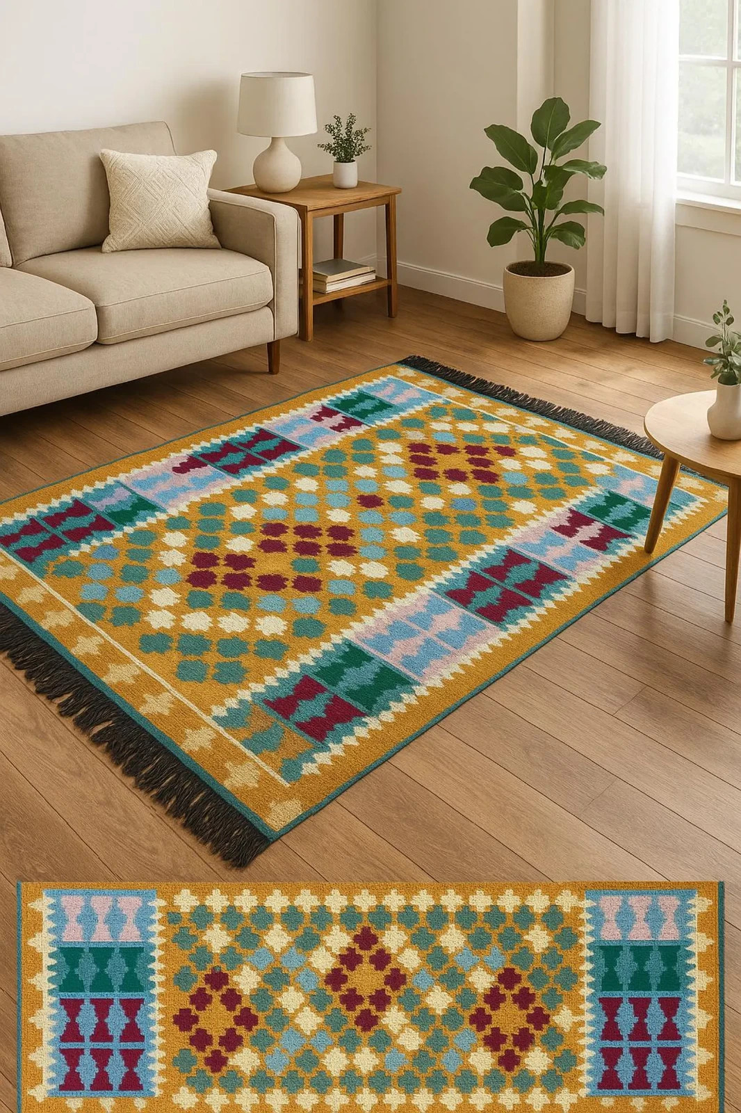 Bring timeless charm into your home with this handwoven wool kilim Dari rug, crafted by skilled artisans using traditional weaving techniques. Its bold geometric tribal motifs and rich earthy colors (red, blue, mustard, cream, and green) make it a versatile piece that enhances both modern and rustic interiors. Perfect for: Living Room: Add warmth and character under a coffee table or as a centerpiece. Entryway/Hallway: A welcoming touch that impresses guests. Office/Study: Stylish accent to elevate your workspace. Bedroom: Layered look or as a bedside rug for cozy mornings. This rug is reversible, durable, and eco-friendly, making it both a decorative and practical choice for everyday living. Features Material: 100% handwoven wool Weave: Flatweave Kilim (Dari style) Design: Geometric tribal patterns with multi-color accents Finish: Hand-knotted fringe on both ends Style: Bohemian, Vintage, Tribal, Ethnic, Farmhouse Usage: Indoor – Living Room, Bedroom, Office, Entryway, Gallery Sizes Available (example, adjust as per your stock) Small: 2 x 3 ft (60 x 90 cm) Medium: 3 x 5ft (90 x 150cm) Large: 5 x 8ft (150 x 240cm) Runner: 2.5 x 8 ft (75 x 240 cm) Care Instructions Vacuum regularly with low suction Spot clean with mild detergent Rotate periodically for even wear Professional cleaning recommended for deep care