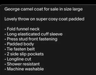 George camel coat for sale in size large Lovely throw on super cosy coat padded • Fold funnel neck • Long elasticated cuff sleeve • Press stud front fastening • Padded body • Tie fasten belt • 2 side slip pockets • Longline cut • Shower resistant • Machine washable Happy to combine postage within 2kg range at a cost of £1.00 per extra item. Thanks, Nik xx Let’s help save the planet 🌎 by buying second hand and being sustainable and help each other by supporting individual sellers.