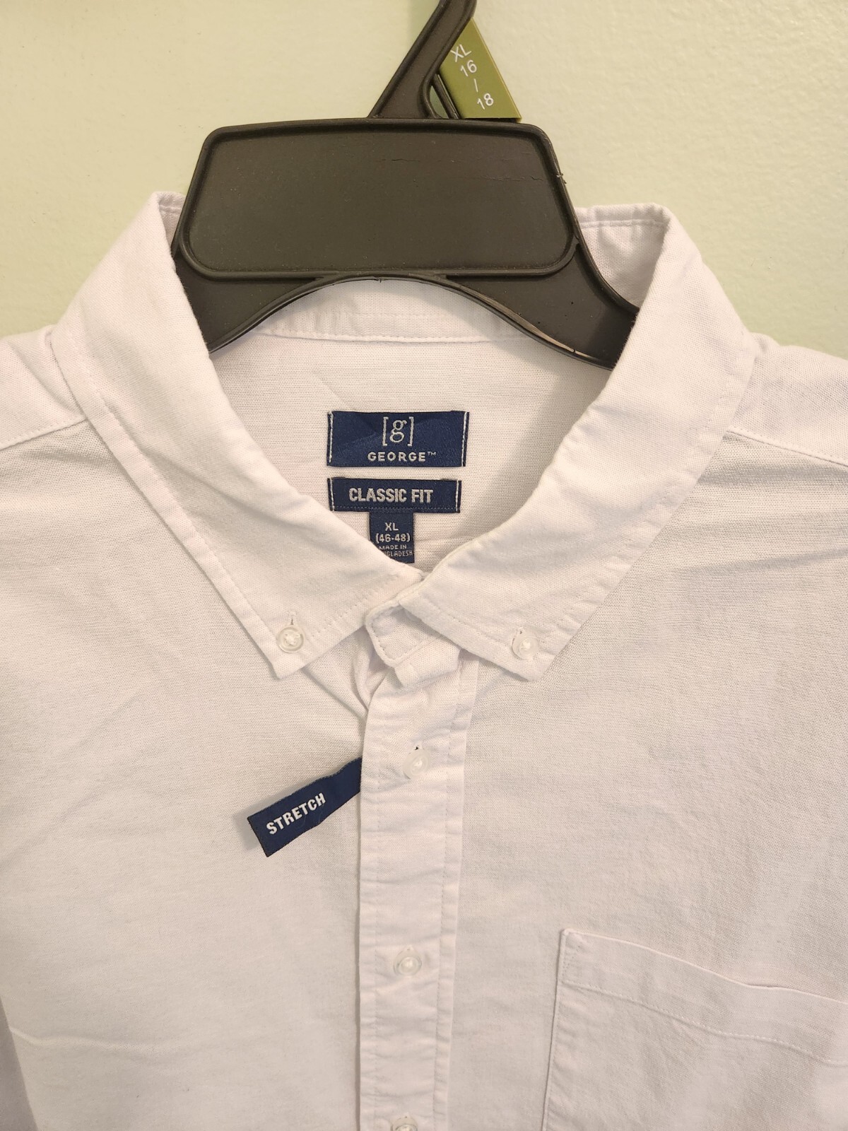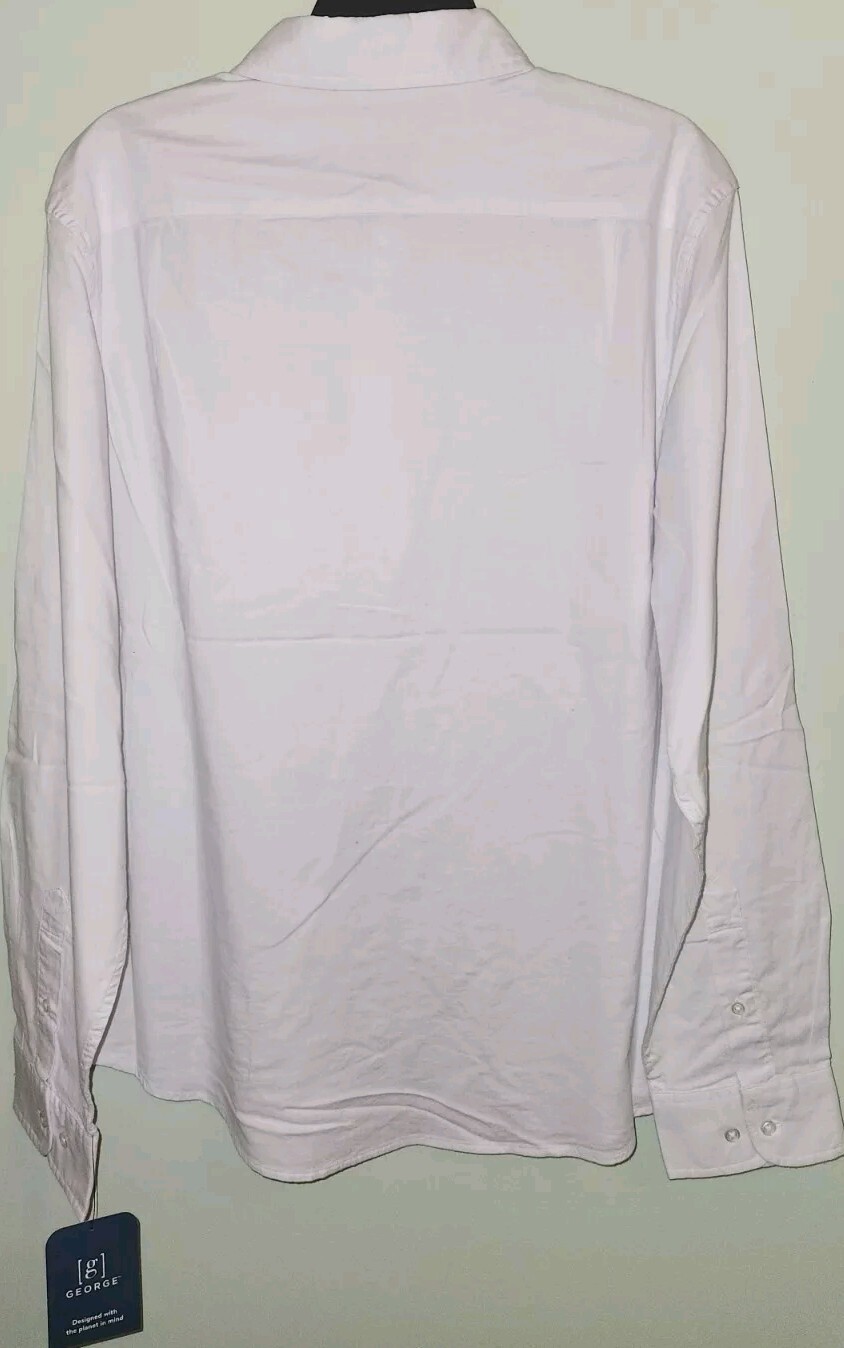 Brand new, tag attached, George Men's XL Long Sleeve WHITE CHAMBRAY Poplin Button Down Shirt. It features a classic button-down collar, button front, button cuffs, relaxed fit and easy machine washable 97% Cotton/3% Spandex. Measures 25.5" across at the armpits and 29.5" in overall length. Absolutely in brand new, perfect, tag attached condition. This item comes from a pet free and smoke free environment. I will ship your item via USPS within 1 business day of receiving your cleared payment. International shipping available. Don't forget to visit my eBay Store and add kidsbargainspot to your list of favorite sellers! Sales tax for your applicable state may apply.
