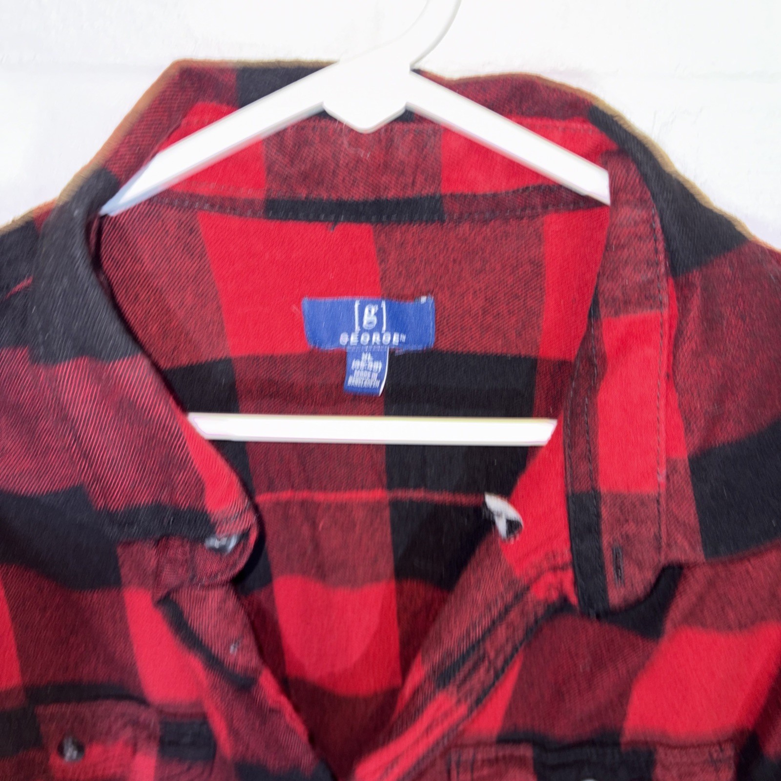 The George Shirt is a men's size XL long sleeve button-up featuring a classic buffalo plaid design in red and black. Made from a comfortable cotton blend flannel, this shirt is machine washable and perfect for the winter, fall, and spring seasons. With a regular fit and collared neckline, this shirt offers both style and comfort with its classic plaid pattern and button closure. Ideal for a casual or dressier look, it also includes convenient pockets for added functionality.