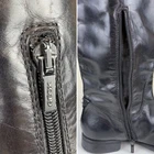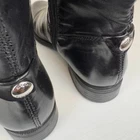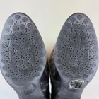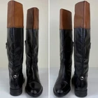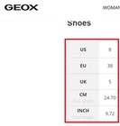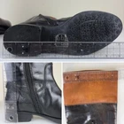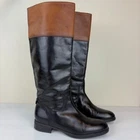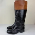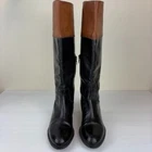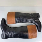 Pull on boot that is breathable and comfortable. Leather upper and insole with polyurethane outsole material. Knee high boots feature black boot with top band in cognac brown. Inside zippers for easy on and off. Round toe and block heel. Silver metal GEOX logo attached to back of boot. SIZE: These are marked a 38 EU, which is equivalent to a US size 8 according to the Geox website size guide (see last image) COLOR: Black, brown MATERIAL CONTENT: Leather Upper / Polyurethane Outsole / Leather Lining STYLE: D83P8K COO: India CONDITION: Very good pre-owned condition with signs of wear to leather upper, including some scuffing and some marks on brown part. Black has rubbed off the zippers in some spots, and there are signs of wear to outsole. Please see photos for details. MEASUREMENTS (approximate; see photos) Heel to Toe Outer: 9.25" Heel Height: 1" Shaft Width Flat Measurement at Top: 6.75" If you have any questions, please don’t hesitate to ask. Thanks for viewing our listing! Equestrian, old money, stylish, comfort, two-tone, British countryside