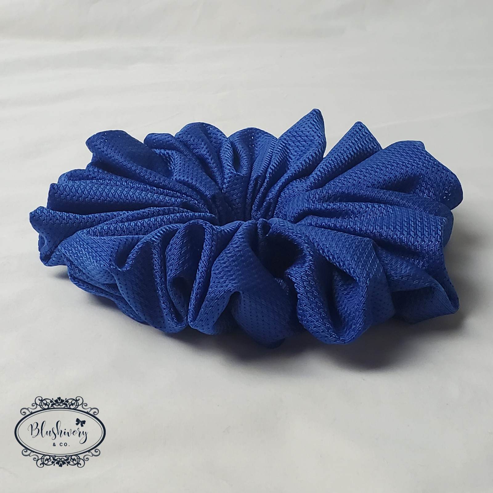 Geraldine Scrunchie -size: Mega (see photo for size comparison) -color/pattern: Blue, solid -Jersey, polyester/rayon. -Machine wash, cold. -New handmade. -Washington USA *Package include: 1pc. Geraldine Scrunchie, Grande size hair tie. ------------------- [scgrnd-jer-056]