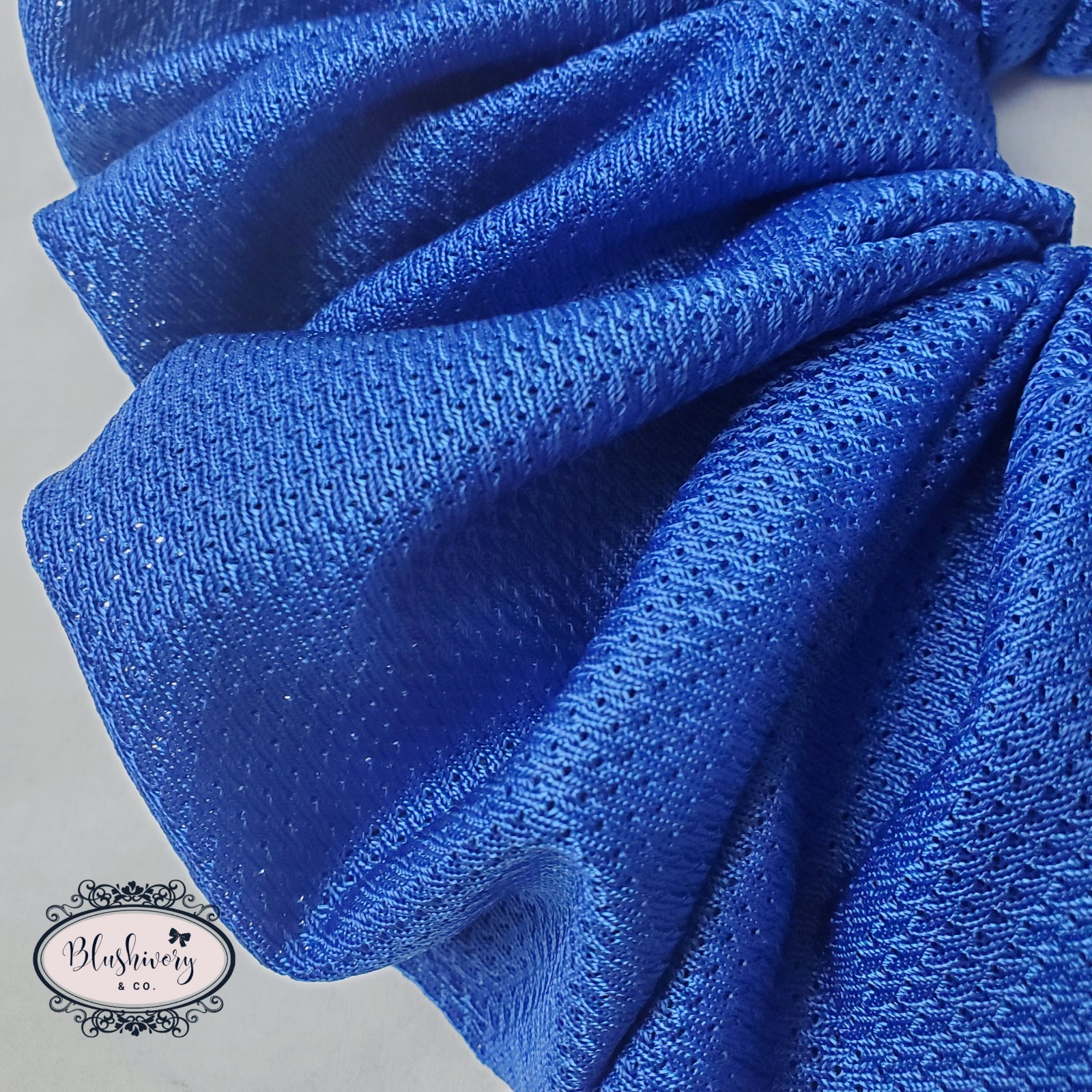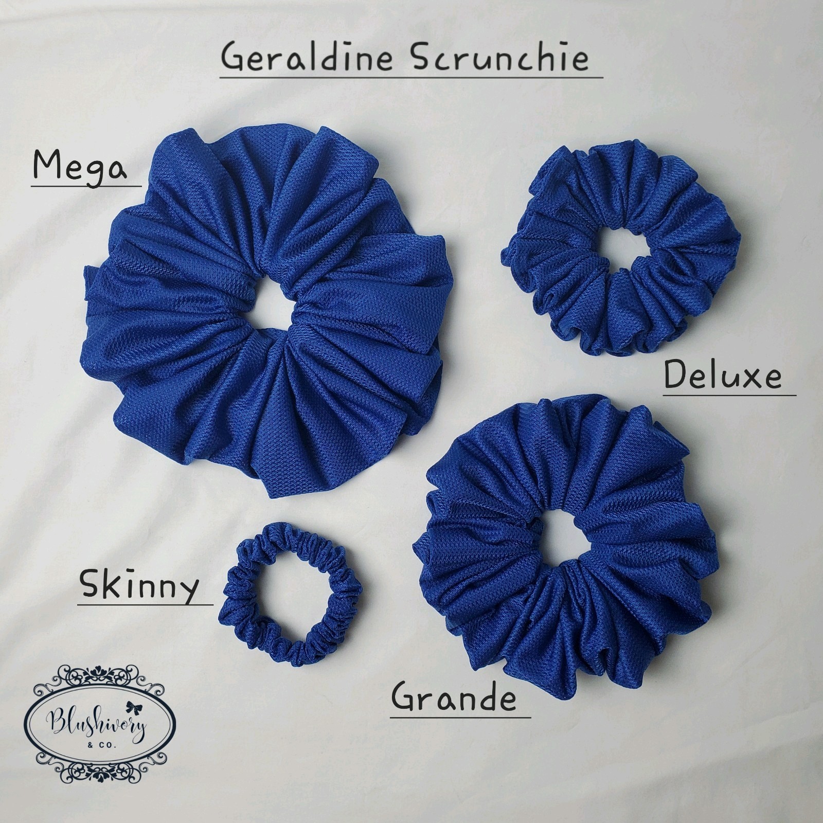 Geraldine Scrunchie -size: Mega (see photo for size comparison) -color/pattern: Blue, solid -Jersey, polyester/rayon. -Machine wash,cold. -New handmade. -Washington USA *Package include: 1pc. Geraldine Scrunchie, Mega size hair tie. ------------------- [scmeg-jer-055]