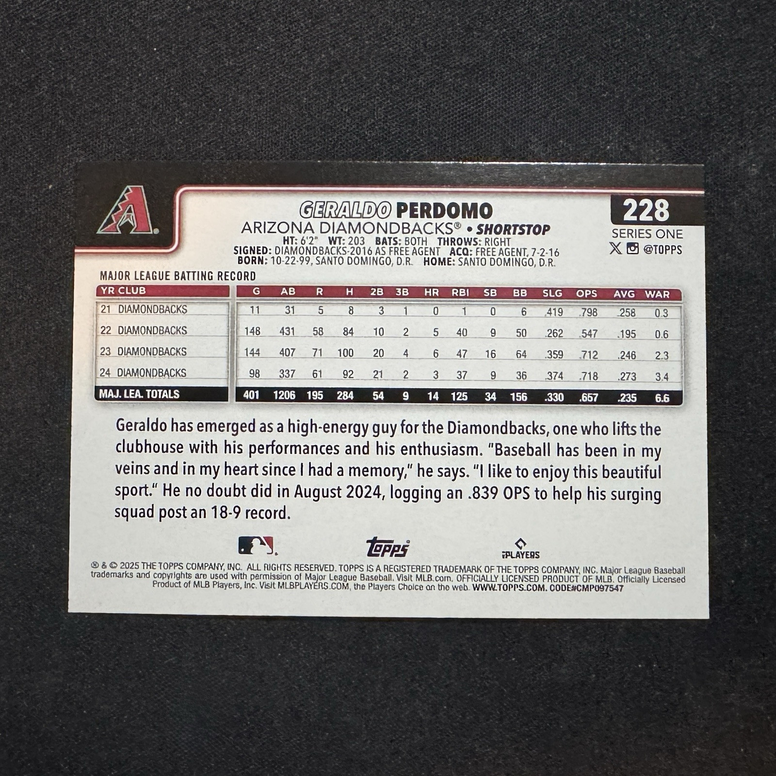 The Geraldo Perdomo Rainbow Foil #228 card is part of the 2025 Topps Series 1 baseball set. This standard-sized card features the Major League player from the Arizona Diamondbacks and is made of card stock in near mint or better condition. The card is an original release by Topps and includes a Rainbow Foil parallel variety, adding a unique touch to the design. It is a sought-after collectible for fans of sports trading cards, specifically for those interested in baseball and the Arizona Diamondbacks team.