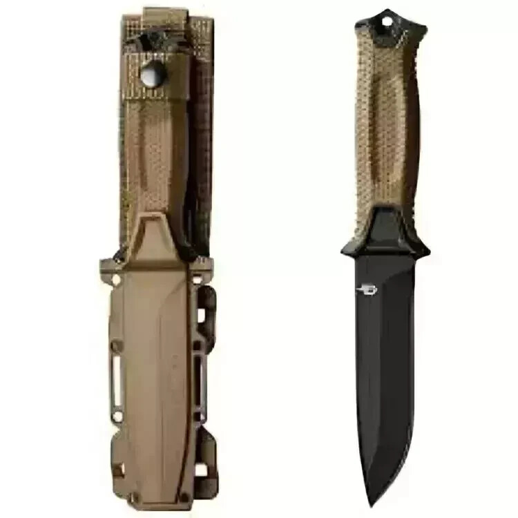 About this item description:: Tactical Knife: The Strongarm knife features a coyote brown handle and a serrated edge, full-tang steel blade Survival Knife: This durable knife has ceramic blade coating and rubberized diamond texture grip Survival Gear: This survival tool can break through hard surfaces in emergencies with the striking pommel Multiple Mounting Options: 4 mounting pieces and sheath can be used for mounting on MOLLE, belt or in drop-leg fashion Gerber Guarantee: As a testament to our unrelenting commitment to quality and service, Gerber is proud to offer a limited lifetime warranty on all products