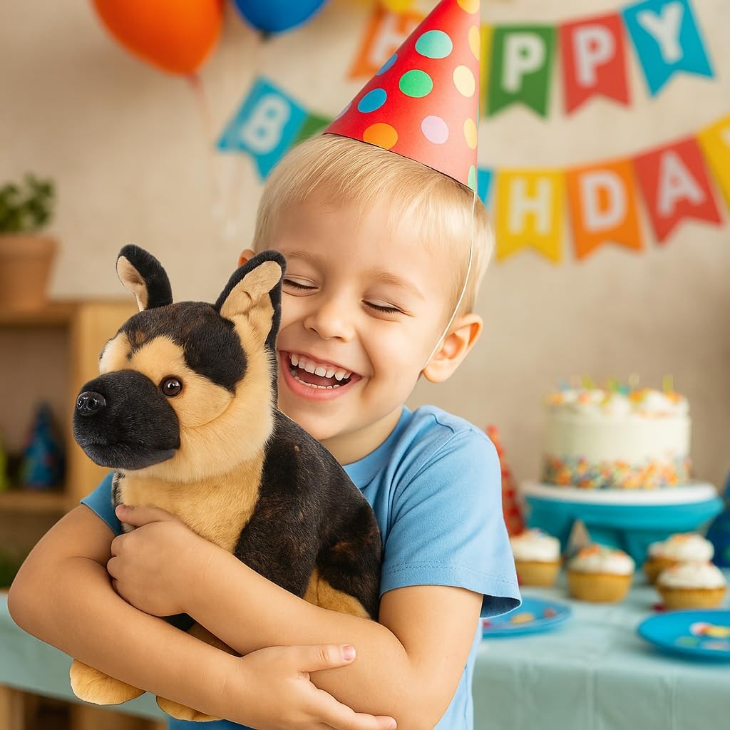 This German shepherd plush toys strive to simulate the effect of the choice of materials in the hair and limb morphology have done a fine treatment, facial details are handmade, just to achieve a lifelike effect. Lifelike 16″ Dog Stuffed Animal: This Stuffed Animal is a realistic plush German Shepherd with black and yellow hair; Our dog plush will delight animal lovers young and old with its attractive features: realistic hair touch, vivid eyes, and cute nose Crafted with Care: Plush dog is securely sewn in high-quality polyester fabrics and filled with white polypropylene plush filling; In particular, the craftsmanship of the eyes and nose is strictly hand-made to match the real animal to a high degree Great Gifting Idea: This German Shepherd plush is authentic in the detail of the face, and the feel of the fur; Cuddly by nature and accurate by design, the dog stuffed animal makes a unique Christmas birhtday Mothers Day gift for mom, sister, grandma, friends Cuddly Christmas Gifts for Grandkids: For its handsome appearance, the German Shepherd is popular with people; The lifelike plush dog is a lovely friend for children, a sweet companion for the elderly, and a perfect toy for pets Customer First: If you have any questions about our products, just let us know and we are alaways online; If you like our shop you can follow, so you don't miss out on interesting new toys