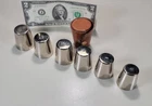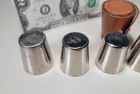 Germany 6 Nesting Shot Glass Set-Leather Case-Travel-Bar/Cocktail DIMENSIONS: Case 2" tall x 1 5/8" diam. Total weight: 94 grams. DESCRIPTION: Vintage nesting shot glass set. 6 nesting shot glasses. Silver- or nickel-plated brass with gilt interior. Maker's marks: all shot glasses as well as the leather case are stamped "Made in Germany". 1930s I believe. Germany. CONDITION: One shot glass (2nd largest) has 2 small shallow dings to the bottom edge. See photos. This does not affect how this shot glass sits or nests. Otherwise all shot glasses and case are in very good original condition with no damage and no significant wear. No restorations. No other dings or dents. No bends, breaks, scuffs. No significant scratches or rubs. No corrosion. No stains to the leather. The snap is functional. No signs of abuse. Old patina as found. Some light scattered oxidation. Light typical handing wear: scattered superficial rubs and scratches. Nothing significant or conspicuous.