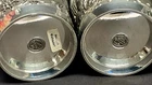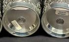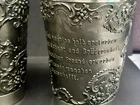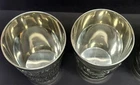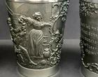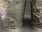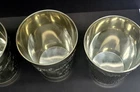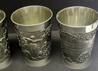 The Angel mark is an unofficial mark that indicates the pewter is lead free and of high quality. It is often found on Continental European pewter. The Angel may be flying, standing with a palm branch in hand, or with a sword and scales. This set of 4 Pewter cups bear this Angel mark as well as a maker’s mark of ES. They are in excellent, like-new condition as you can see in the photos. Each measures approx 4.5 inches tall, and 3.375 inches at the mouth. Below is the translation of the wordings found on the cups: Der mensch is weinlos halb erstorben The man is half dead without wine Der wein bringt scherz und bruderschaft The wine brings jokes and brotherhood Der wein hat manchen Freund erworben The wine has acquired many a friend Das wasser manchen abgeschafft The water has been abolished for some