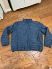 This Gerry down jacket for men in size 2XL features a lightweight and packable design with 650 fill power for warmth. The jacket is blue with a full zip closure and a stand-up collar. It is suitable for travel and casual wear, ideal for outdoor activities like walking and hiking. The jacket has a solid pattern, nylon outer shell and lining, and includes pockets for convenience.