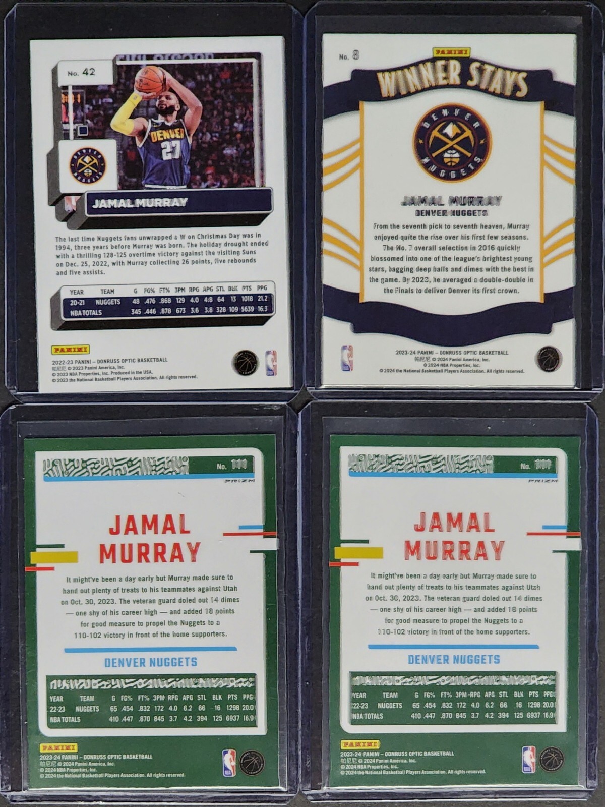Elevate your basketball card collection with this $5 Jamal Murray lot, featuring four dynamic cards from the 2022-24 Panini Optic series. Each card showcases the Denver Nuggets star in stunning designs, including the eye-catching Hyper Pink and Green Shock inserts, that capture the energy and skill of one of the NBA's rising talents. Crafted by Panini, the renowned manufacturer, these cards are produced in the United States with high-quality card stock and come in standard size. The set includes cards numbered 111, 8, and 42 from the 2023-24 season, ensuring you get the latest offerings. This lot is an essential pick for fans and collectors alike, offering a piece of basketball history without the need for autographs.