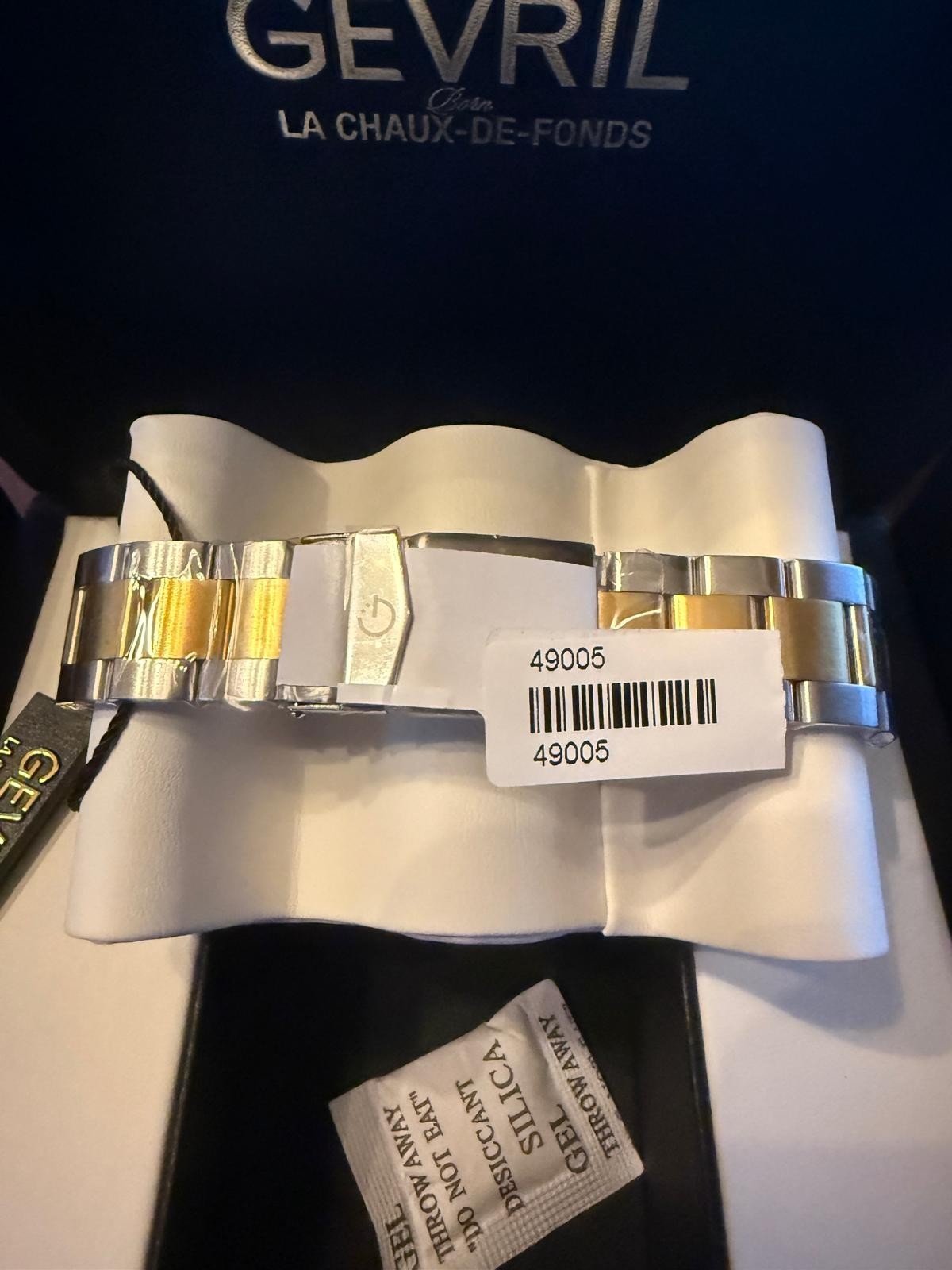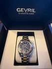 Stainless steel case with a two-tone (silver-tone and yellow gold-tone) stainless steel bracelet. Fixed yellow gold-tone bezel with an inlaid blue ring showing tachymeter markings. Blue dial with yellow gold-tone hands and index hour markers. Minute markers around the outer rim. Dial Type: Analog. Luminescent hands and markers. Date display at the 6 o'clock position. Two sub-dials displaying: day of the week and 24 hour. Automatic movement. Scratch resistant sapphire crystal. Screw down crown. Transparent case back. Round case shape. Case size: 44 mm. Case thickness: 14 mm. Band width: 18 mm. Deployment clasp with a push button release. Water resistant at 50 meters / 165 feet. Functions: date, day, hour, minute, second, tachymeter. Additional Info: tachymeter, multi function month day and date indicator. Lenox Series. Luxury watch style. Watch label: Swiss Made. Gevril Lenox Automatic Blue Dial Men's Watch 49005.