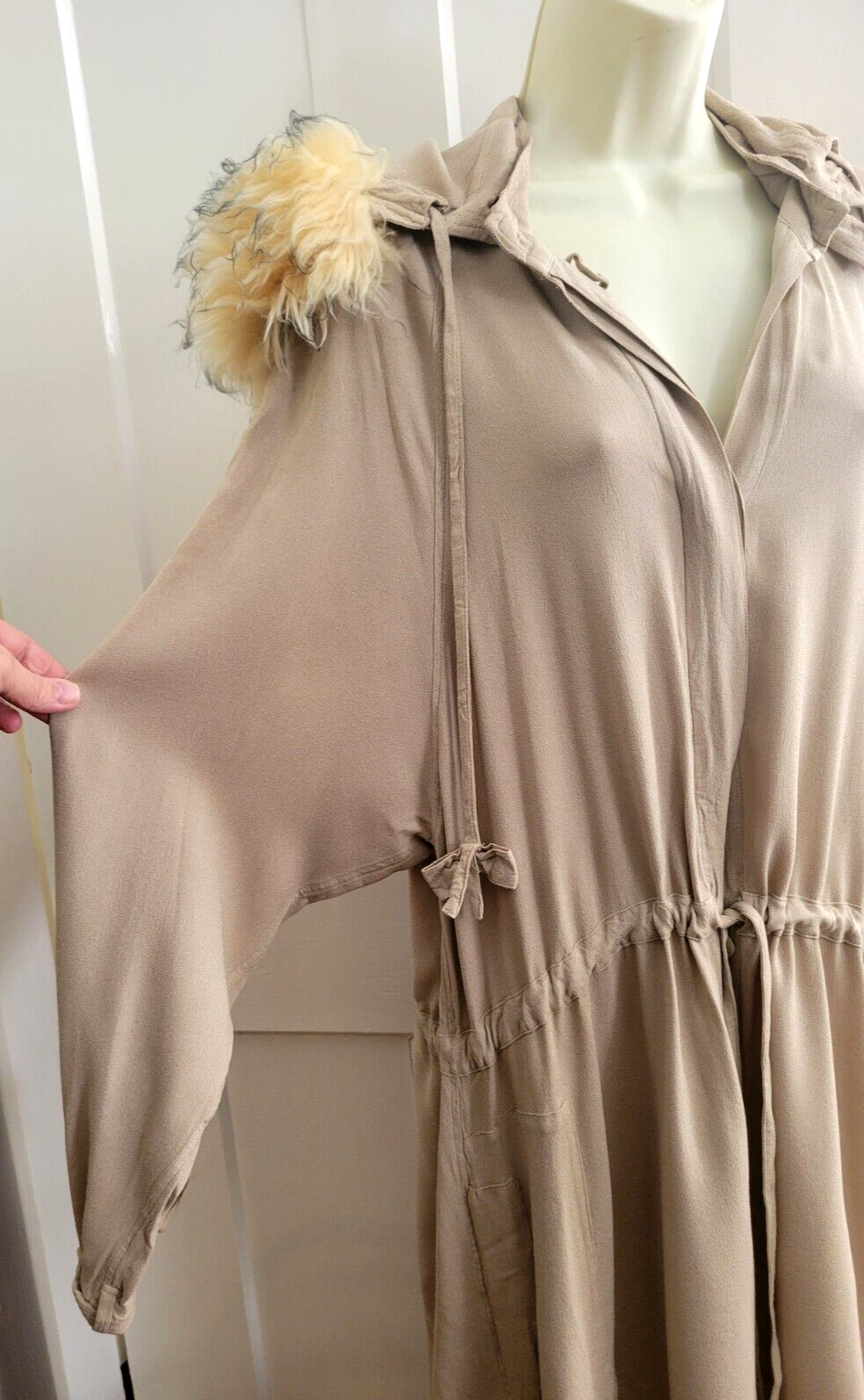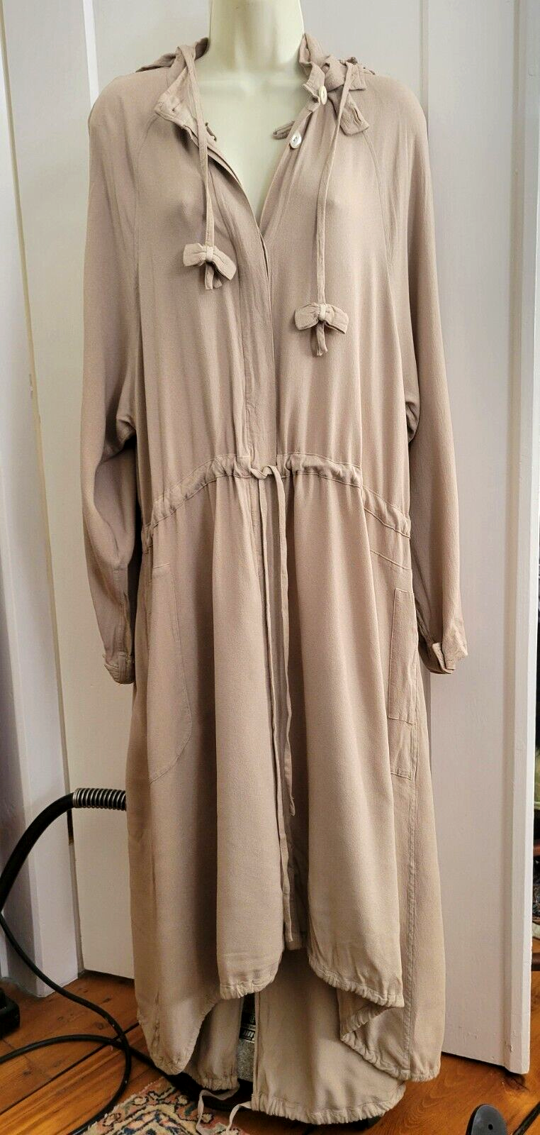 Ghost of London single layer rayon duster jacket with removable fur collar hood and drawstrings at the neck waist and hem. Mother of pearl buttons are hidden behind a solid placket. Packable layer for trips to countries where modesty is the norm. Pockets make it very practical! Great neutral color, soft lightweight and breathable outer layer Machine wash (except for hood) and hang dry.