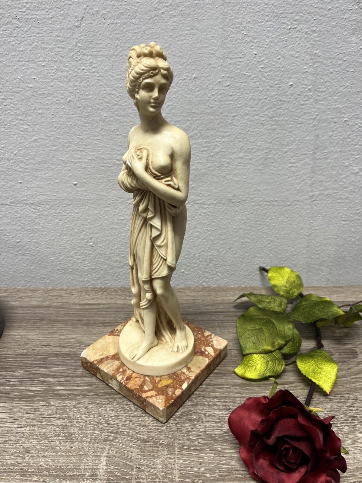 This stunning Giannelli statue is a beautiful reproduction of a classic Greek sculpture. Crafted from high-quality alabaster material, this statue is a true masterpiece. The intricate details and lifelike quality of this piece make it a must-have for any art collection. Measuring 16 inches in height, this statue is a perfect addition to any home or office. Its classical design and Greek culture make it a unique and valuable piece. Made in Italy, this statue is a true work of art that will stand the test of time. It’s beautiful work of art is a preowned vintage piece. She is fared pretty well over the years, but she does have a few smudges on her legs and buttocks from storage and a chip in the bottom corner of the marble stand she is attached to. Price has been adjusted for flaws.