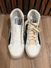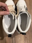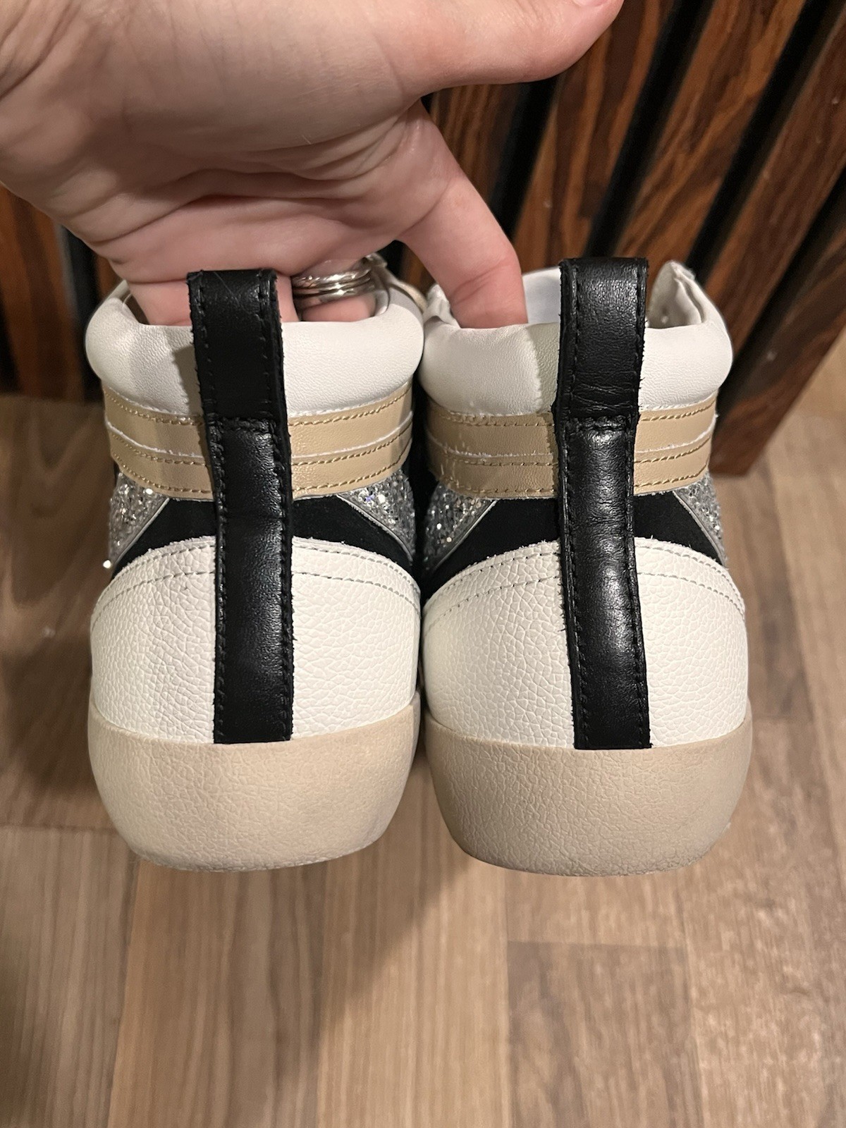 The Gianni Bini Black and White High-Top Sneakers with Glitter in size 7.5 are stylish athletic shoes designed for casual occasions. Featuring a lace-up closure and rubber outsole, these sneakers offer comfort and support for walking activities. Sadly, one of the leases are missing, but you can buy laces anywhere !