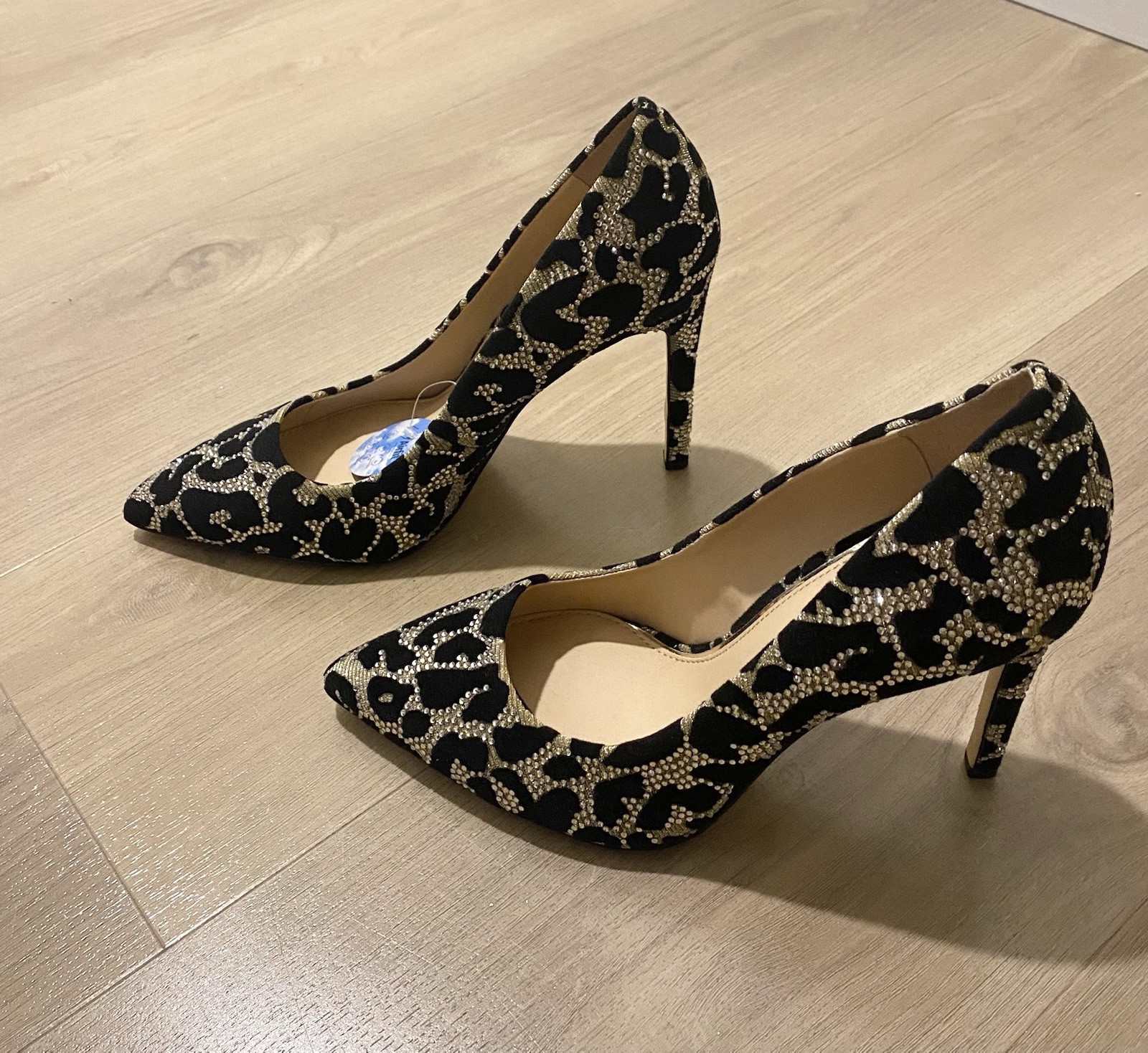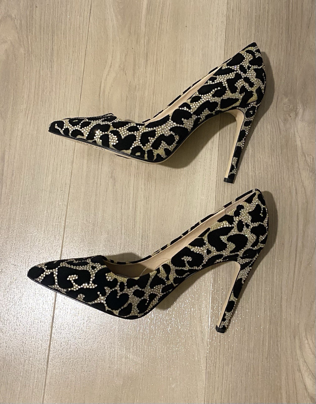 NEW. Never Worn. Tags. No Box. The Gianni Bini Women's Black & Silver Rhinestone Leopard Pattern 4" Pumps Shoes are a stylish and elegant choice for various occasions. These heels feature a pointed toe shape and 4" heel, perfect for formal events, weddings, parties, and even business meetings. The silver rhinestone accents add a touch of glamour, while the leopard print pattern adds a playful yet sophisticated touch. With a comfortable medium shoe width, these pumps are both fashion-forward and practical for any woman looking to make a statement with her footwear.