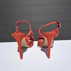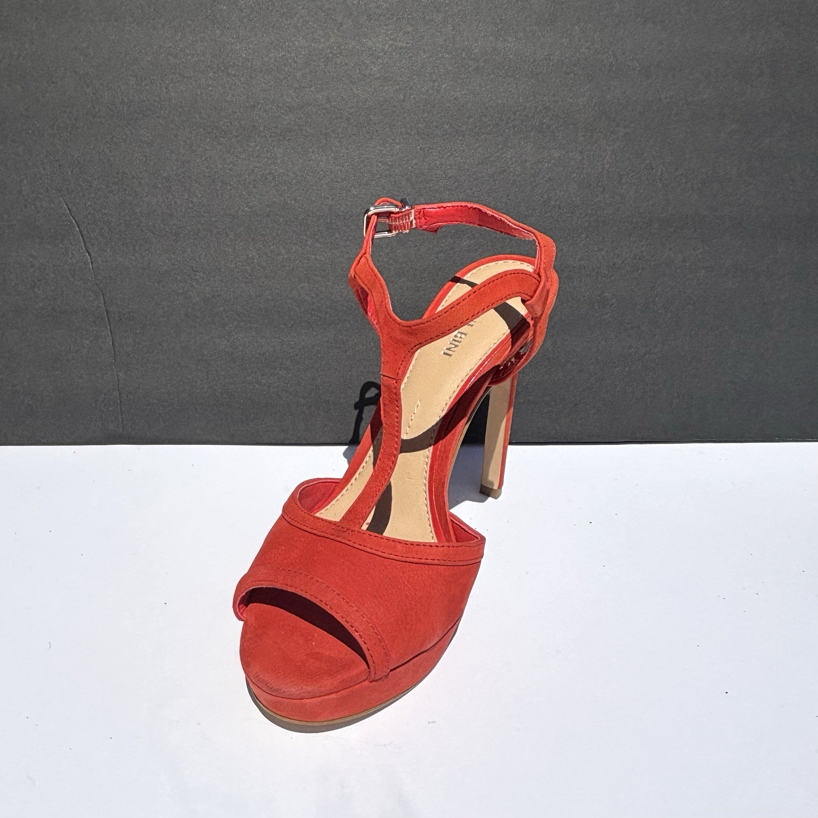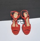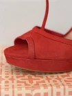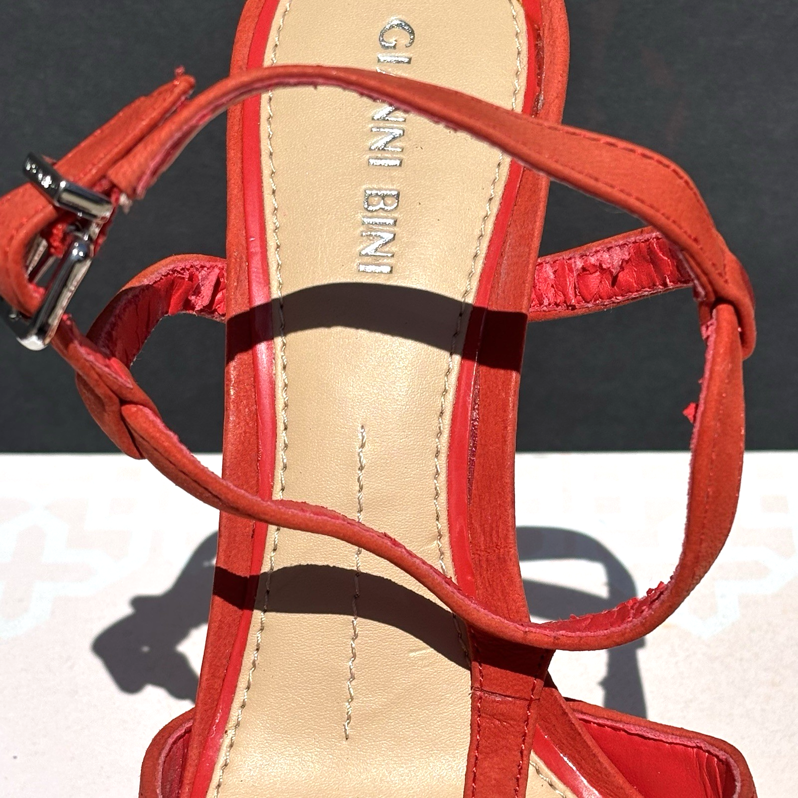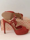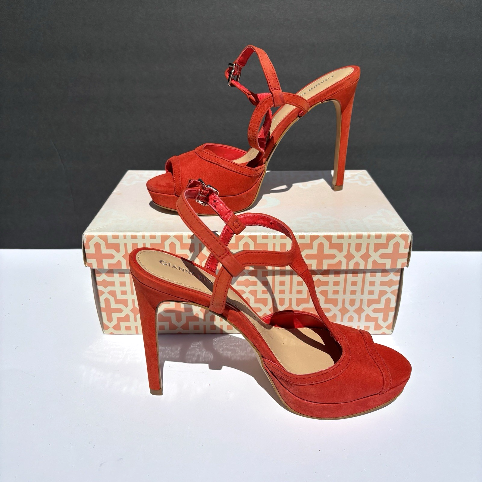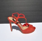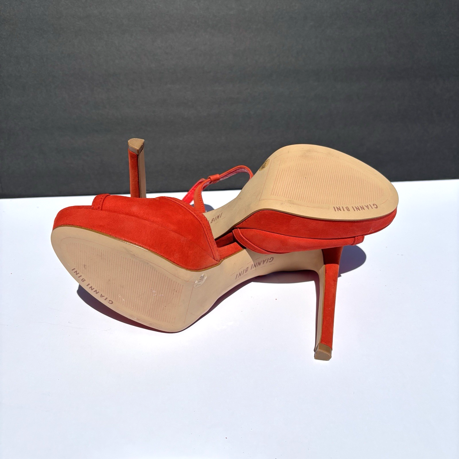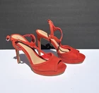 Gianni Bini Women's Red Orange Suede Open Toe Platform Stiletto Heels in size 7.5 are a stylish choice for special occasions. These ultra-high 5" (12.5cm) heels feature a round toe, adjustable ankle straps, and cushioned platform for added comfort & stability. The fiery red/orange color makes them a vibrant standout choice for formal events, parties, weddings, or business meetings. Awesome for summer, fall, or spring, these heels are sure to make a statement wherever you go. The leather lining along the ankle strap is peeling a bit although they have never been worn, the suede has some minimal wear in a few spots, but the shoes are in good condition overall. Please see pics for more details.