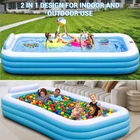 Inflatable Pool Large - 145'' X 74'' X 22'', Oversize Blow Up Pool with Pump (Blue) Large Inflatable Pool - Our super large swimming pool measures 145 "X 74" X 22 ", with a capacity of 744 gallons, and can accommodate up to 6 adults simultaneously 0.6mm Thickened Material - The blow up pool is made of 0.6mm thickened material to prevent puncturing. You can enjoy the cool summer with your pet Inflatable Seat and Backrest - The inflatable swimming pool features comfortable inflatable seats and backrests, providing a better experience for your summer water parties Solar-Powered & Color Changing - The inflatable pool equipped with led lights, and the solar panels can be charged during the day, with up to 12 hours of lighting after a fully charged. And the LED lights has 7 color changes and 4 light modes, addding more fun to your family swimming pool 3 Air Chambers - The 3-chamber inflatable swimming pool has 3 independent chambers, each of which is inflated separately. Such a structure is more stable and less likely to collapse 3-5 Minutes Inflation - Just need 3-5 minutes to inflate the whole pool. Then add water to about 70-80% of the pool's capacity and have fun with your family(Pump Included) For All Summer Activities - Our inflatable swimming pool can be used not only as an outdoor pool, but also as an indoor ball pool and fishing pool, so that you and your family can fully enjoy the warmth of home. Best Summer Gift - The inflatable swimming pool is the perfect gift for your friends and family. This rectangular inflatable pool is perfect for your birthday party, water party or family picnic What You Get - 1 Large Family Pool, 1 Use Manual,1 Electric Air Pump, 3 Patches