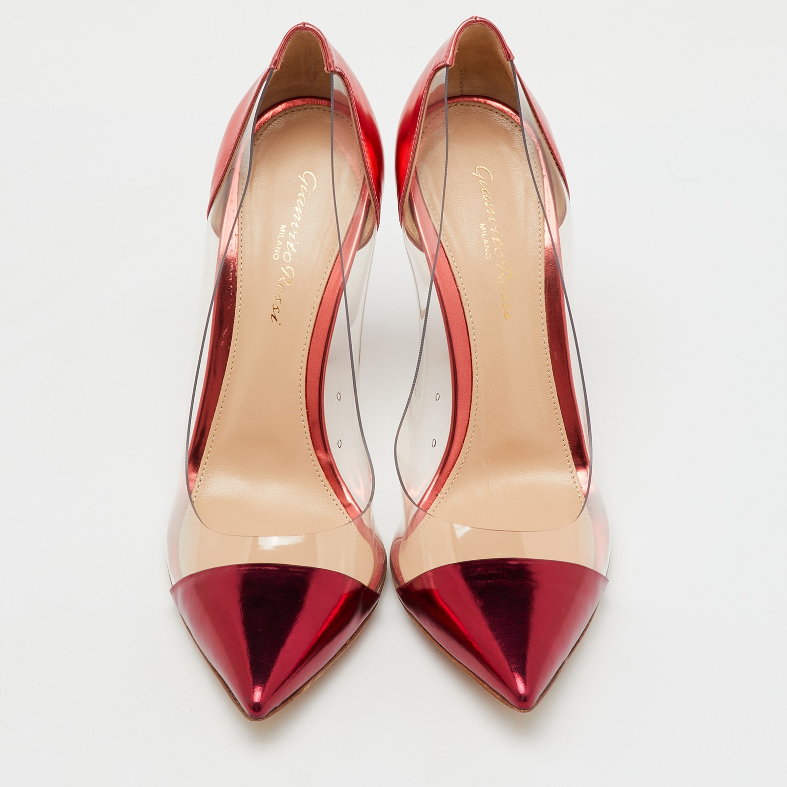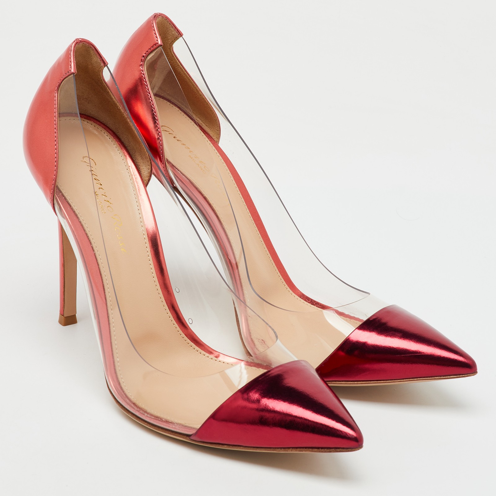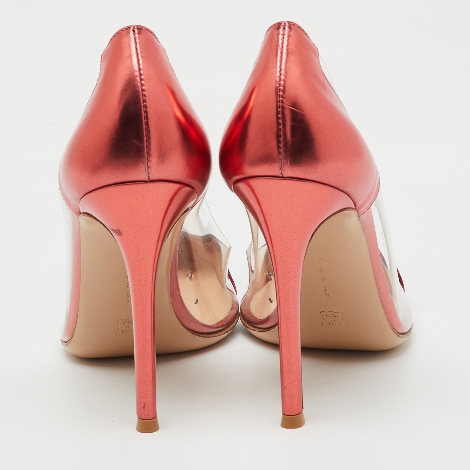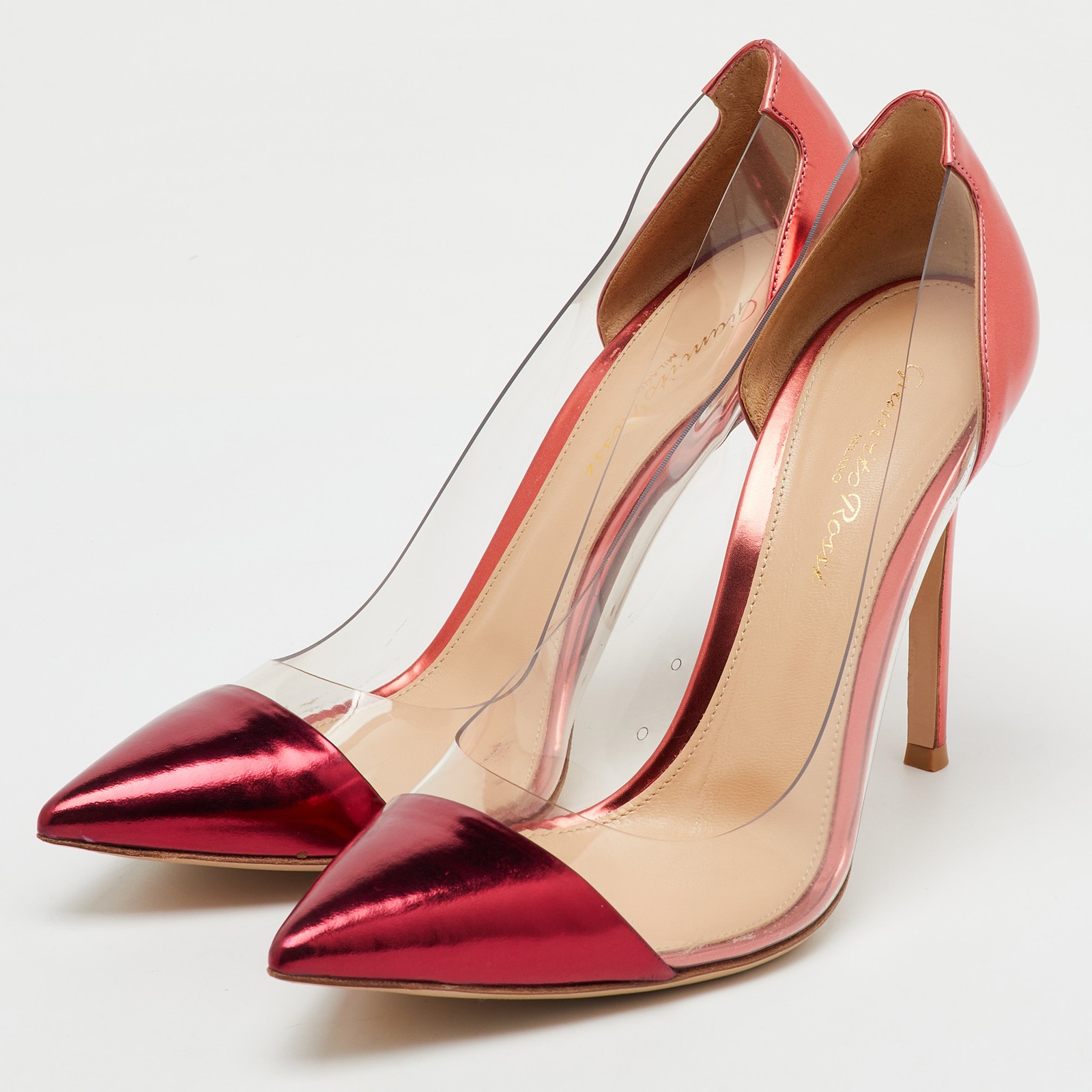 A flash of burgundy metallic leather and see through PVC panels make these Gianvito Rossi pumps both stunning and sharp.Certified by The Luxury Closet - This item has gone through a detailed authentication process overseen by our experts. We offer a lifetime guarantee of authenticity on all our items. Import duties, taxes and charges are not included in the item price. These charges are the buyers responsibility. Please check with your country’s customs office to determine what these additional cost will be prior to buying. Our eBay Store About Us Contact Us Add to Favorite Sellers Gianvito Rossi Metallic Burgundy Leather and PVC Plexi Pointed Toe Pumps Size 38.5 $320.1 A flash of burgundy metallic leather and see through PVC panels make these Gianvito Rossi pumps both stunning and sharp. Product Details Brand Color Burgundy Dimensions Material Leather, PVC Size 38.5 Outsole Width Outsole Length Heel Height Includes Certified by The Luxury Closet This item has gone through a detailed authentication process overseen by our experts. We offer a lifetime guarantee of authenticity on all our items. How We Check The in-house team of experts at The Luxury Closet is highly trained to verify the authenticity and the condition of the luxury products. They ensure that only 100% authentic items are put on sale.The evaluation process is unique with its own mix of assessment criteria and differs according to the category. Each item is evaluated based on the following combination of hallmarks, hardware, stitching, symmetry, material, craftsmanship, stamping, codes, hologram stickers, and packaging. Our authenticators also check if the items have been modified or amended (e.g., aftermarket diamonds, replaced batteries, repaired bags, etc.) International Buyers Import duties, taxes and charges are not included in the item price. These charges are the buyers responsibility. Please check with your country’s customs office to determine what these additional cost will be prior to buying.