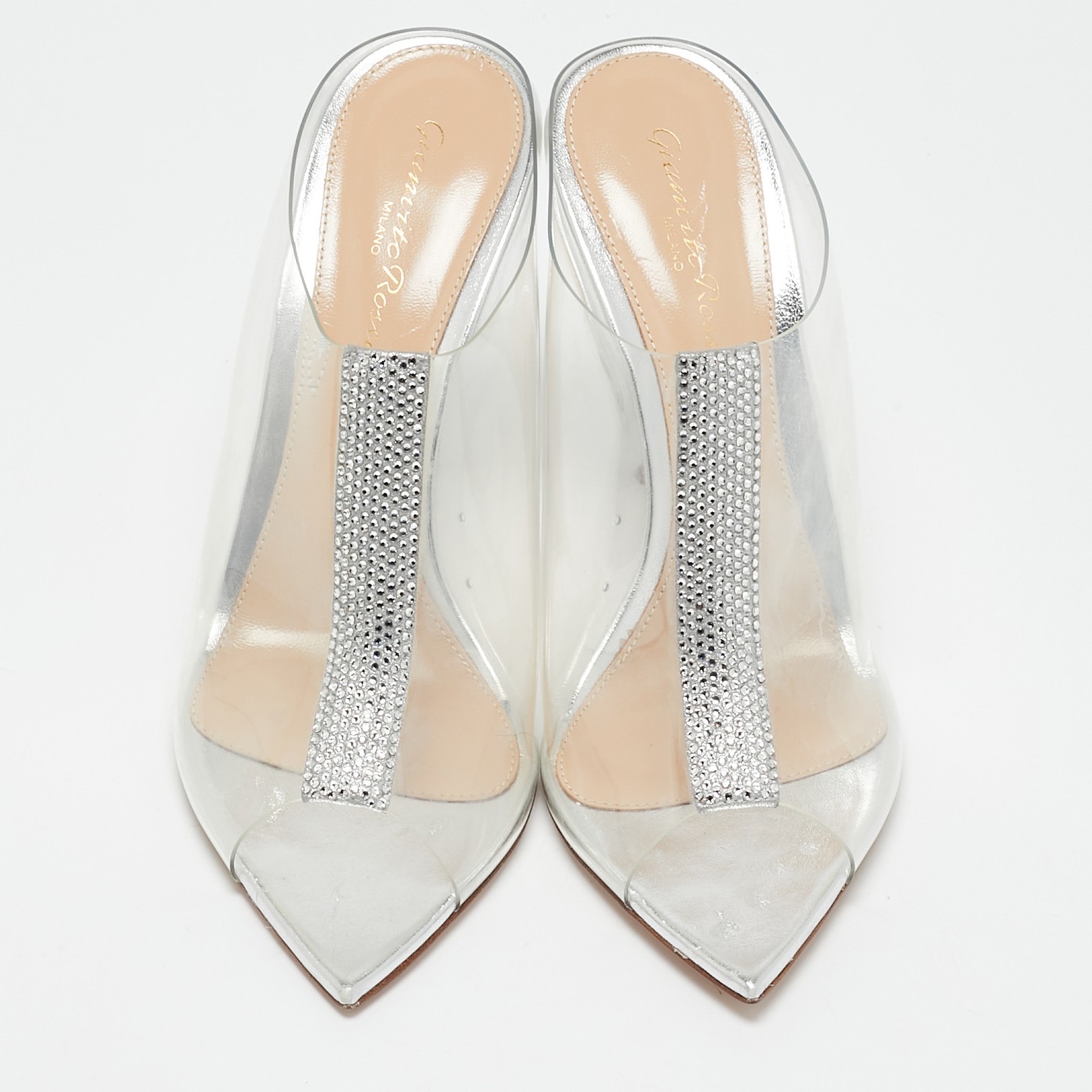 Perfectly sewn and finished to ensure an elegant look and fit, these designer shoes are a purchase youll love flaunting. They look great on the feet.Certified by The Luxury Closet - This item has gone through a detailed authentication process overseen by our experts. We offer a lifetime guarantee of authenticity on all our items. Import duties, taxes and charges are not included in the item price. These charges are the buyers responsibility. Please check with your country’s customs office to determine what these additional cost will be prior to buying. Our eBay Store About Us Contact Us Add to Favorite Sellers Gianvito Rossi Transparent PVC Crystal Embellished Sigma Mules Size 37 $427.9 Perfectly sewn and finished to ensure an elegant look and fit, these designer shoes are a purchase youll love flaunting. They look great on the feet. Product Details Brand Color Transparent Dimensions Material PVC Size 37 Outsole Width 8.5 cm Outsole Length 23 cm Heel Height 11.5 cm Includes The Luxury Closet Packaging Certified by The Luxury Closet This item has gone through a detailed authentication process overseen by our experts. We offer a lifetime guarantee of authenticity on all our items. How We Check The in-house team of experts at The Luxury Closet is highly trained to verify the authenticity and the condition of the luxury products. They ensure that only 100% authentic items are put on sale.The evaluation process is unique with its own mix of assessment criteria and differs according to the category. Each item is evaluated based on the following combination of hallmarks, hardware, stitching, symmetry, material, craftsmanship, stamping, codes, hologram stickers, and packaging. Our authenticators also check if the items have been modified or amended (e.g., aftermarket diamonds, replaced batteries, repaired bags, etc.) International Buyers Import duties, taxes and charges are not included in the item price. These charges are the buyers responsibility. Please check with your country’s customs office to determine what these additional cost will be prior to buying.