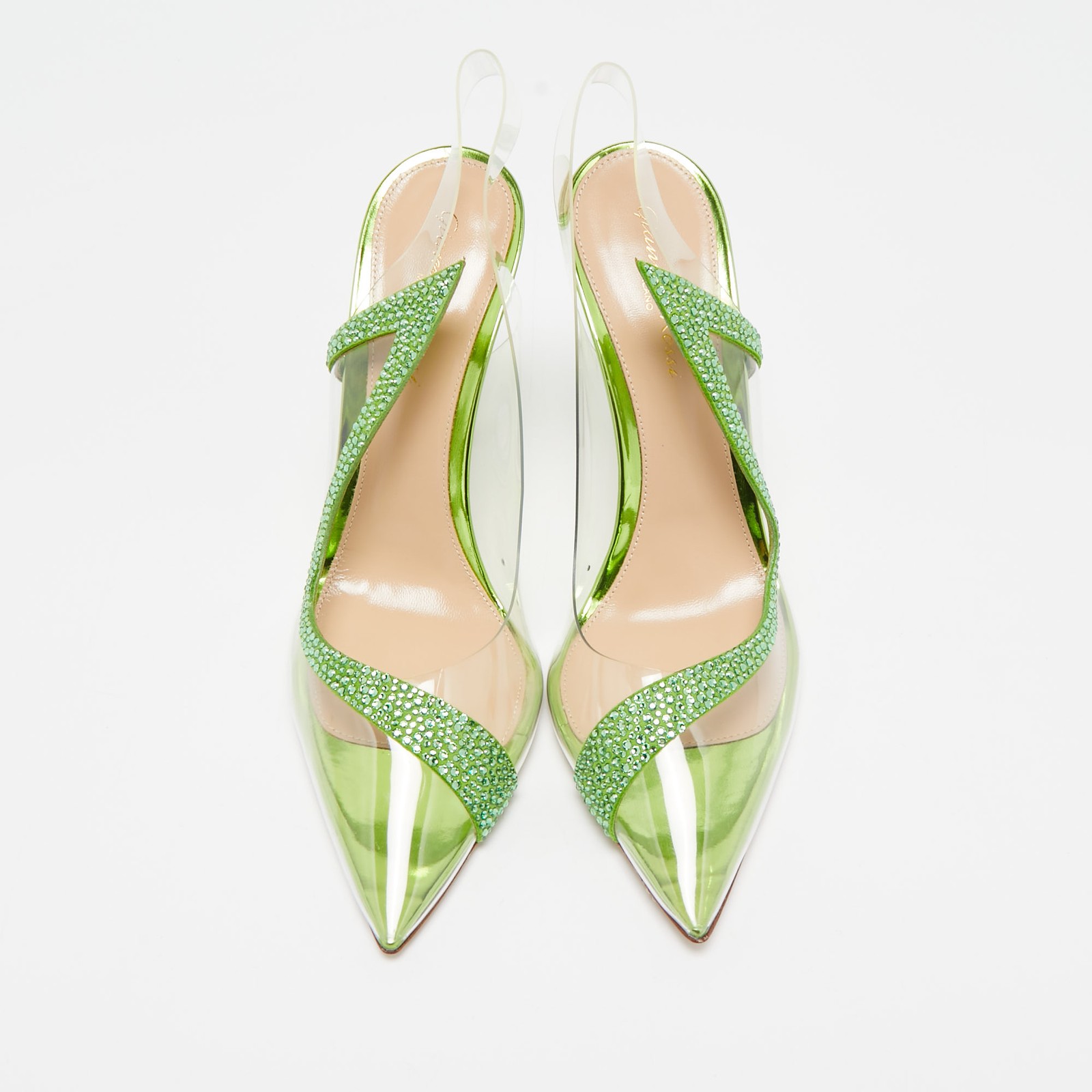 The Gianvito Rossi Hortensia pumps showcase a modern blend of luxury and innovation. Featuring a clear PVC design accented with green suede and intricate embellishments, these pumps offer a bold yet refined aesthetic. The pointed toe and slender stiletto heel create a sleek silhouette, perfect for adding sophistication to evening or formal looks.Certified by The Luxury Closet - This item has gone through a detailed authentication process overseen by our experts. We offer a lifetime guarantee of authenticity on all our items. Import duties, taxes and charges are not included in the item price. These charges are the buyers responsibility. Please check with your country’s customs office to determine what these additional cost will be prior to buying. Our eBay Store About Us Contact Us Add to Favorite Sellers Gianvito Rossi Transparent/Green PVC and Suede Embellished Hortensia Pumps Size 39.5 $481.8 The Gianvito Rossi Hortensia pumps showcase a modern blend of luxury and innovation. Featuring a clear PVC design accented with green suede and intricate embellishments, these pumps offer a bold yet refined aesthetic. The pointed toe and slender stiletto heel create a sleek silhouette, perfect for adding sophistication to evening or formal looks. Product Details Brand Color Transparent Dimensions Material PVC, Suede Size 39.5 Outsole Width 8 cm Outsole Length 24 cm Heel Height 11cm Includes Original Dustbag, Original Box, Info Card Certified by The Luxury Closet This item has gone through a detailed authentication process overseen by our experts. We offer a lifetime guarantee of authenticity on all our items. How We Check The in-house team of experts at The Luxury Closet is highly trained to verify the authenticity and the condition of the luxury products. They ensure that only 100% authentic items are put on sale.The evaluation process is unique with its own mix of assessment criteria and differs according to the category. Each item is evaluated based on the following combination of hallmarks, hardware, stitching, symmetry, material, craftsmanship, stamping, codes, hologram stickers, and packaging. Our authenticators also check if the items have been modified or amended (e.g., aftermarket diamonds, replaced batteries, repaired bags, etc.) International Buyers Import duties, taxes and charges are not included in the item price. These charges are the buyers responsibility. Please check with your country’s customs office to determine what these additional cost will be prior to buying.