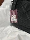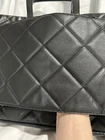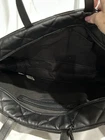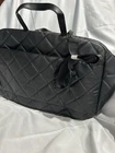 The Gilda Paris Large Quilted Tote Black Bag with "G" Logo is a stylish and practical accessory for travel. This rectangular tote features a zip closure, black vegan leather exterior with a quilted finish, and black metal hardware accents. The bag comes with a wide shoulder strap and double handles for easy carrying. The tote also features an “over the carryon handle” extra wide attached flap to make travel more convenient. The black fabric lining and detachable strap add versatility to this unisex adults' bag, making it a must-have for on-the-go occasions. The subtle "G" logo detail on the front adds a touch of personal style to the classic black tote design.