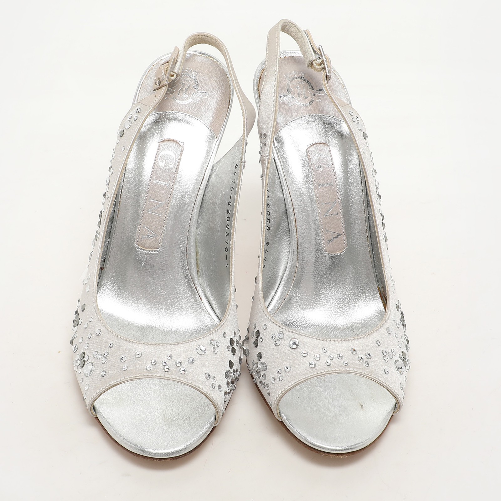 Make a chic style statement with these designer pumps. They showcase sturdy heels and durable soles, perfect for your fashionable outingsCertified by The Luxury Closet - This item has gone through a detailed authentication process overseen by our experts. We offer a lifetime guarantee of authenticity on all our items. Import duties, taxes and charges are not included in the item price. These charges are the buyers responsibility. Please check with your country’s customs office to determine what these additional cost will be prior to buying. Our eBay Store About Us Contact Us Add to Favorite Sellers Gina Silver Satin Crystal Embellished Peep Toe Slingback Pumps Size 38 $155.1 Make a chic style statement with these designer pumps. They showcase sturdy heels and durable soles, perfect for your fashionable outings Product Details Brand Color Silver Dimensions Material Satin Size 38 Outsole Width 8 cm Outsole Length 21 cm Heel Height 10 cm Includes The Luxury Closet Packaging Certified by The Luxury Closet This item has gone through a detailed authentication process overseen by our experts. We offer a lifetime guarantee of authenticity on all our items. How We Check The in-house team of experts at The Luxury Closet is highly trained to verify the authenticity and the condition of the luxury products. They ensure that only 100% authentic items are put on sale.The evaluation process is unique with its own mix of assessment criteria and differs according to the category. Each item is evaluated based on the following combination of hallmarks, hardware, stitching, symmetry, material, craftsmanship, stamping, codes, hologram stickers, and packaging. Our authenticators also check if the items have been modified or amended (e.g., aftermarket diamonds, replaced batteries, repaired bags, etc.) International Buyers Import duties, taxes and charges are not included in the item price. These charges are the buyers responsibility. Please check with your country’s customs office to determine what these additional cost will be prior to buying.