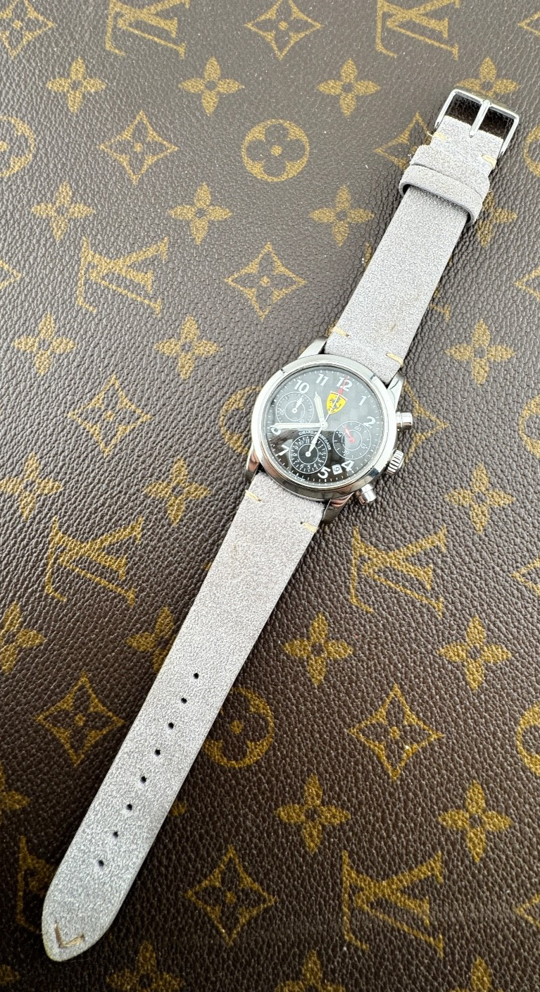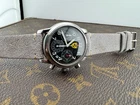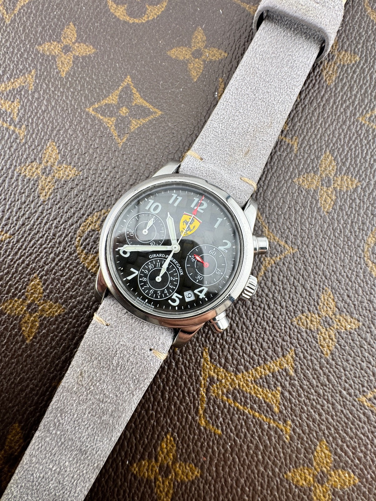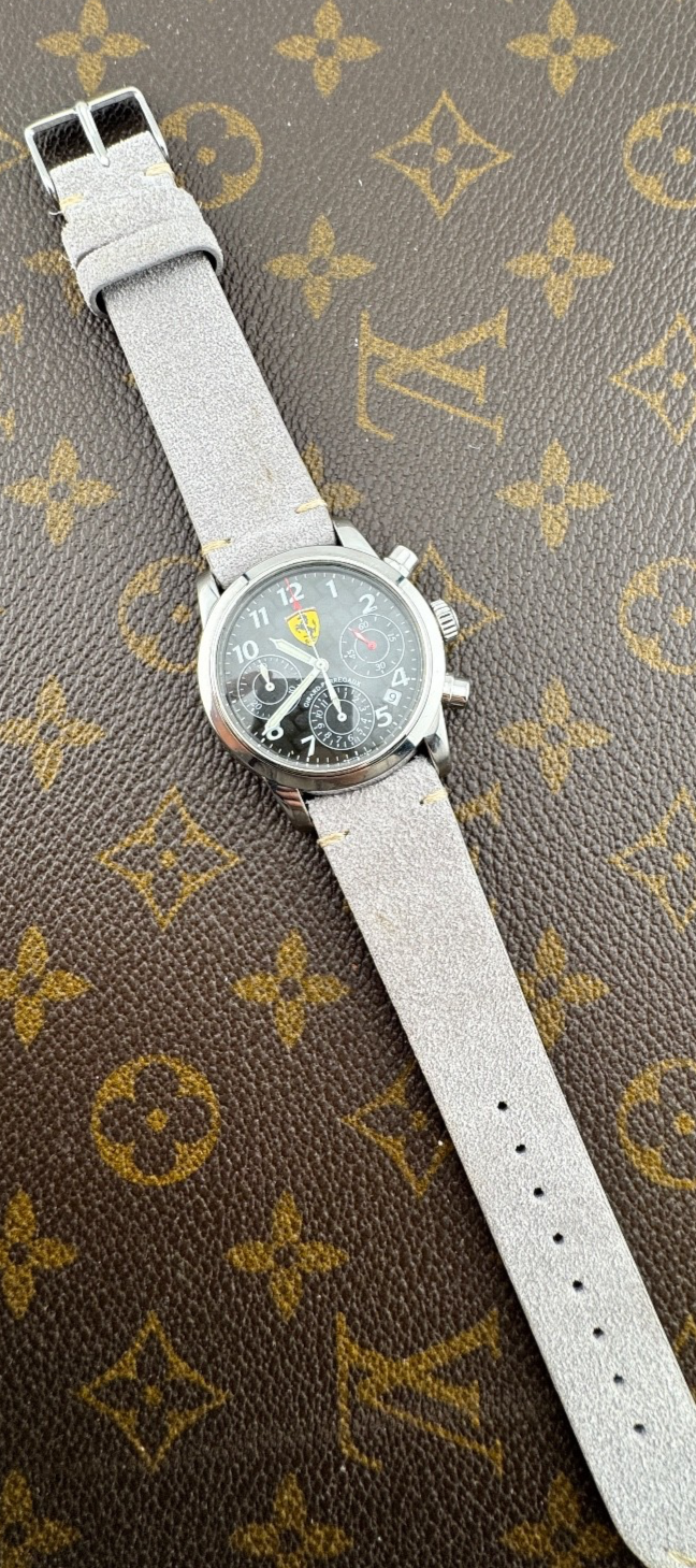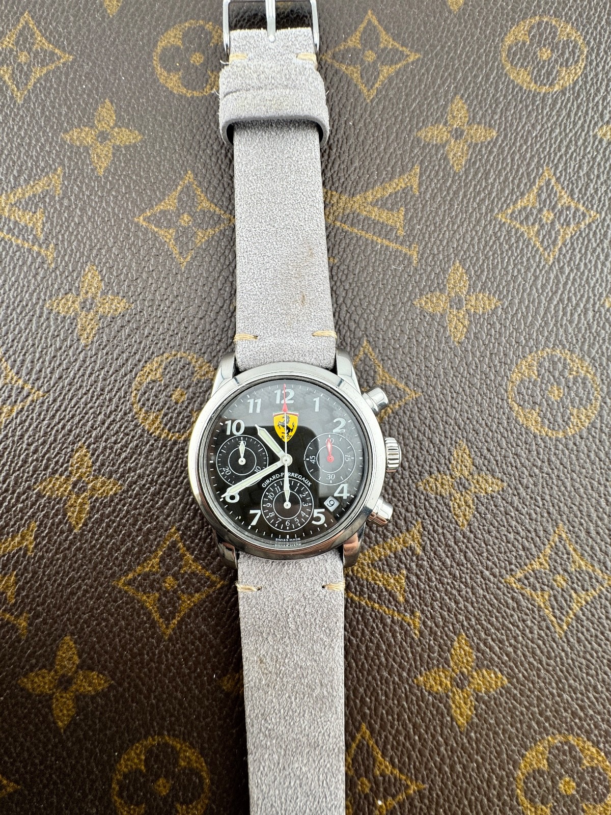PROPONIAMO; -Marca: GIRARD PERREGAUX CRONOGRAFO FERRARI -Cassa: ACCIAIO DA 38MM ESCLUSA CORONA , FONDELLO ORIGINALE SERRATO CON 8 VITI -Movimento :ORIGINALE GP SU BASE ETA , COEVO -Vetro:MINERALE BOMBATO -Corona:ORIGINALE -Ghiera: LISCIA -Tasti: POMPA -Quadrante: NERO CARBONIO ORIGINALE -Lancette: ORIGINALI -Cinturino/Bracciale: CINTURINO GRIGIO 20MM GENERICO NUOVO -Scatola e documenti: NOSTRA POCHETTE IN VELLUTO COMPRESA -Condizioni : OTTIME -Revisionato:SI -Uomo/donna/unisex:UOMO PER QUALSIASI DUBBIO CONTATTATEMI ,RISPONDEREMO IL PRIMA POSSIBILE