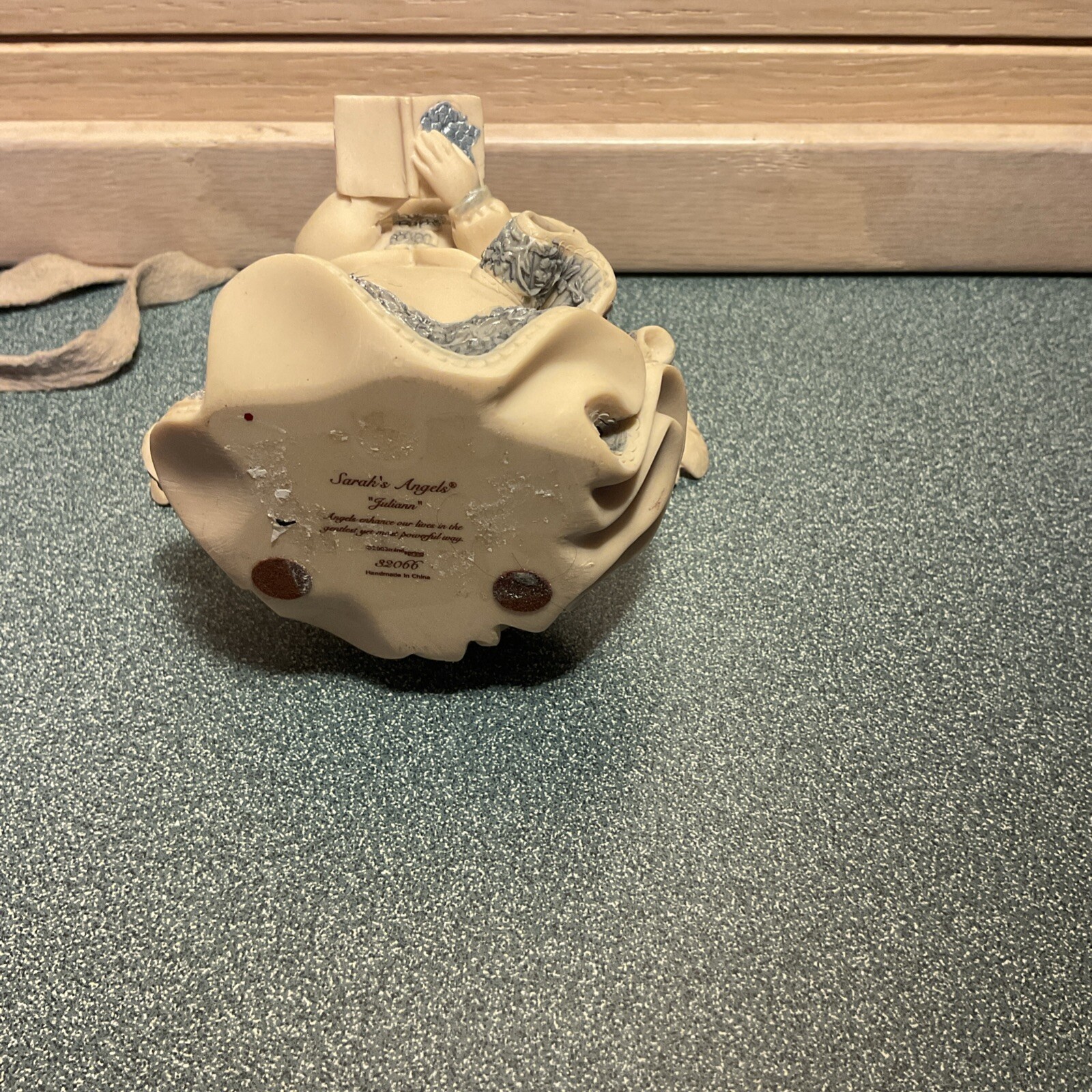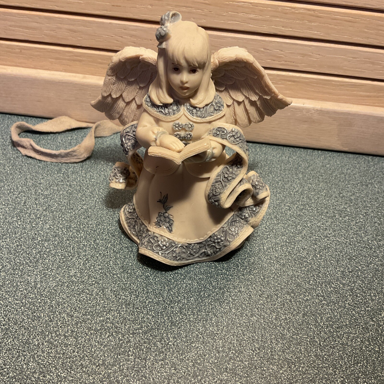 This is a small multicolor resin figurine of a girl angel singing from a book. The figurine is 4 inches in length, 5 inches in height, and 4 inches in width, weighing 1 lb. It has a traditional style and is part of the Sarah Angels brand. Suitable for any room, this figurine would make a lovely addition to any collection or decor. No chips.