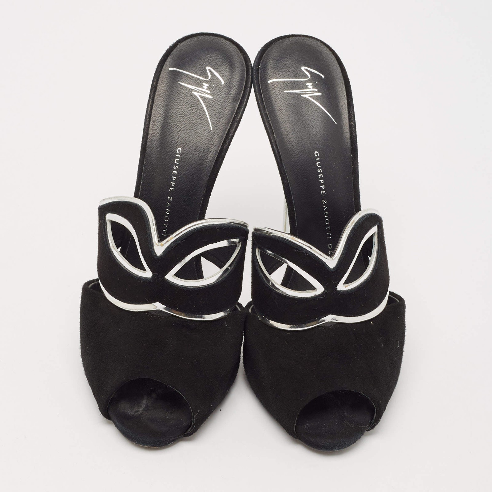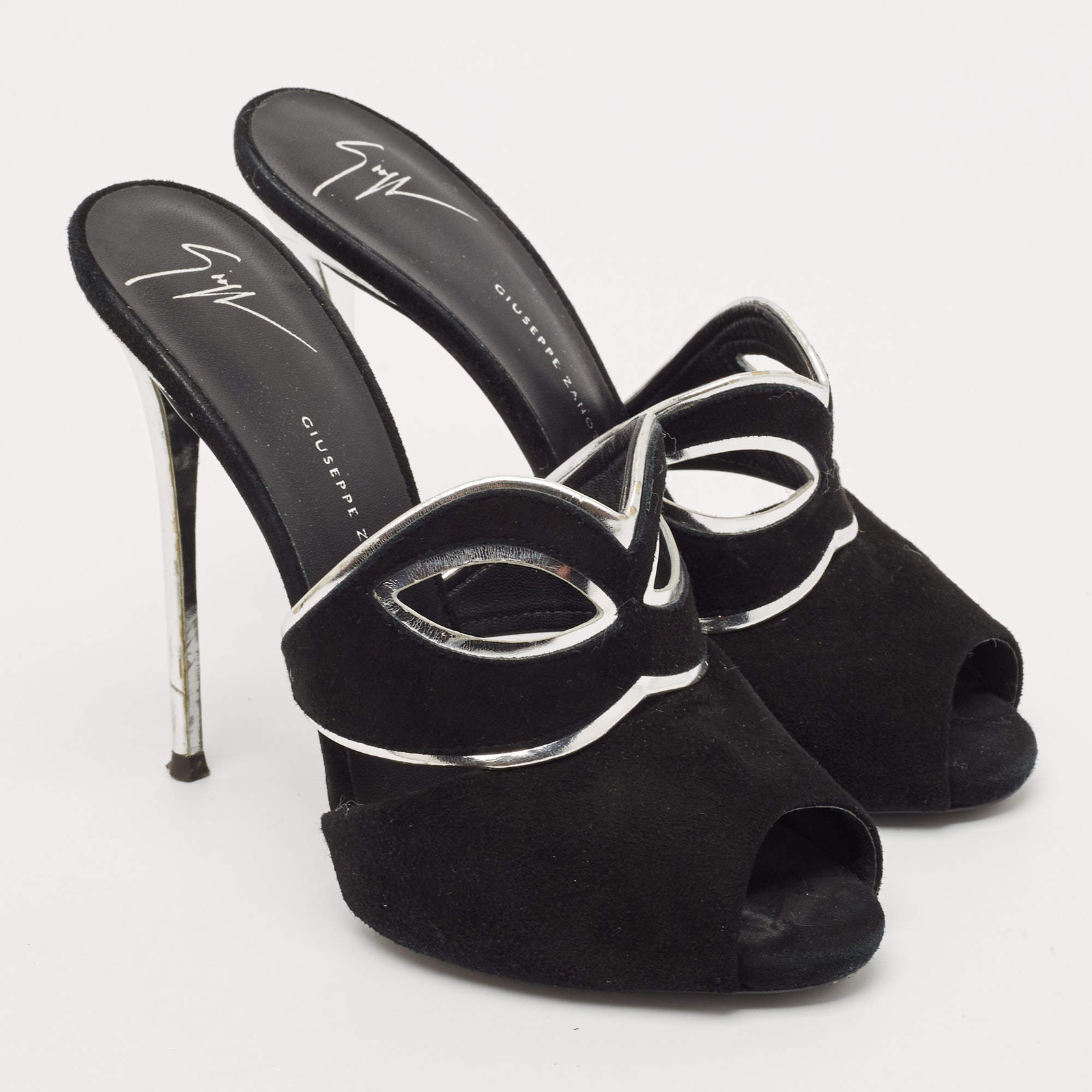 Our eBay Store About Us Contact Us Add to Favorite Sellers Giuseppe Zanotti BlackSilver Suede and Leather Peep Toe Mules Size 39 A perfect blend of luxury, style, and comfort, these designer mules are made using quality materials and frame your feet in the most elegant way. They can be paired with a host of outfits from your wardrobe. Product Details Brand Giuseppe Zanotti Color Black Includes The Luxury Closet Packaging Outsole Length 20 cm Outsole Width 7.5 cm Size 39 Certified by The Luxury Closet This item has gone through a detailed authentication process overseen by our experts. We offer a lifetime guarantee of authenticity on all our items. How We Check The in-house team of experts at The Luxury Closet is highly trained to verify the authenticity and the condition of the luxury products. They ensure that only 100% authentic items are put on sale.The evaluation process is unique with its own mix of assessment criteria and differs according to the category. Each item is evaluated based on the following combination of hallmarks, hardware, stitching, symmetry, material, craftsmanship, stamping, codes, hologram stickers, and packaging. Our authenticators also check if the items have been modified or amended (e.g., aftermarket diamonds, replaced batteries, repaired bags, etc.) International Buyers Import duties, taxes and charges are not included in the item price. These charges are the buyers responsibility. Please check with your country’s customs office to determine what these additional cost will be prior to buying.