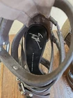 These Giuseppe Zanotti brown leather strap sandals are a stylish and fashionable choice for any occasion. With a zip closure and ultra high stiletto heel, these gladiator-style sandals exude a rock-inspired vibe perfect for parties, weddings, or formal events. Made in Italy with leather lining and outsole, these sandals are both durable and luxurious. The brown color and spike accents add a touch of edginess to the design, making them a bold and sophisticated statement piece for any fashion-forward woman....B2456