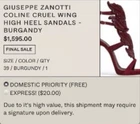 A scene-stealing Italian sandal in an iconic Firewings silhouette and crowned with a dramatic crescendo of polished flames and lifted by a sky-high stiletto heel. Striking a balance between whimsical and edgy, Giuseppe Zanotti's Burgundy cage sandals are armored with sweeping, sculptural wing embellishment for an unforgettable evening look. Heel Style: Stiletto Toe Style: Open Toe 5" heel; 3/4" platform, 4" ankle strap height. Made in Italy. FABRIC / MATERIAL suede upper, leather lining, leather sole FIT TIP Fits true to size.