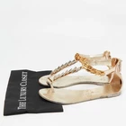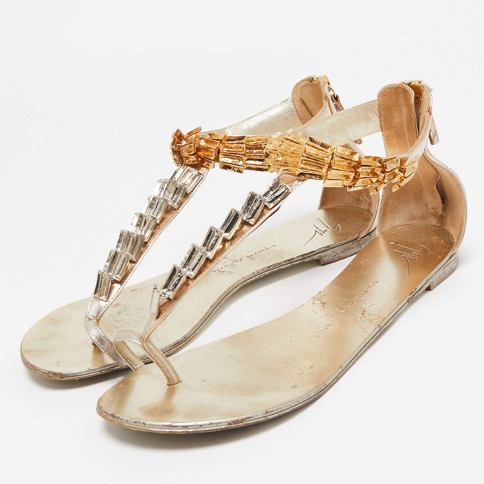 Our eBay Store About Us Contact Us Add to Favorite Sellers Giuseppe Zanotti Gold Leather Embellished Ankle Strap Flat Sandals Size 41 Radiating elegance, these Giuseppe Zanotti flat sandals are crafted from metallic gold leather with exquisite embellishments for a touch of opulence. The ankle strap adds a secure yet stylish finish, making them ideal for both daytime chic and evening glamour. Product Details Brand Giuseppe Zanotti Color Gold Includes The Luxury Closet Packaging Outsole Length 27 cm Outsole Width 10 cm Size 41 Certified by The Luxury Closet This item has gone through a detailed authentication process overseen by our experts. We offer a lifetime guarantee of authenticity on all our items. How We Check The in-house team of experts at The Luxury Closet is highly trained to verify the authenticity and the condition of the luxury products. They ensure that only 100% authentic items are put on sale.The evaluation process is unique with its own mix of assessment criteria and differs according to the category. Each item is evaluated based on the following combination of hallmarks, hardware, stitching, symmetry, material, craftsmanship, stamping, codes, hologram stickers, and packaging. Our authenticators also check if the items have been modified or amended (e.g., aftermarket diamonds, replaced batteries, repaired bags, etc.) International Buyers Import duties, taxes and charges are not included in the item price. These charges are the buyers responsibility. Please check with your country’s customs office to determine what these additional cost will be prior to buying.