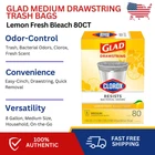 ELIMINATES TRASH AND BACTERIAL ODORS ON THE BAG: Glad with Clorox helps you take control of odors by eliminating trash and bacterial odors on the garbage bag; packaging may vary EASY-CINCH DRAWSTRING: Handle all your daily household demands with medium trash bags that tie with a quick cinch of the drawstring for easy trash removal CLEAN-SMELLING SCENT: These garbage bags feature a Lemon Fresh Bleach scent that gently freshens your home with just a hint of sparkling clean scent 8 GALLON GREY MEDIUM TRASH BAGS: Glad wastebasket liners are great for medium garbage cans, general household needs and just the right size for cars and on-the-go messes CLEANING MADE EASY: Glad with Clorox garbage bags work as hard as you do to help maintain a clean and healthy feeling home with a versatile design for bins around the home