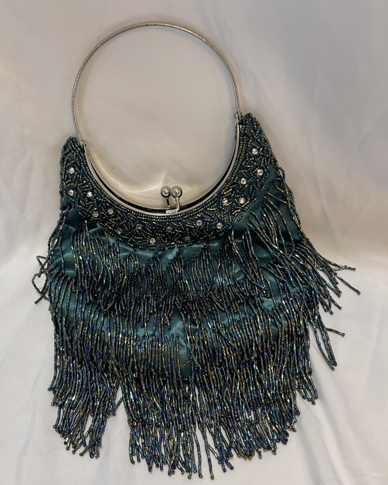 Stunning satin turquoise hand-beaded peacock fringe purse with round metal handle and jewel embellishments. Silver frame evening bag with round handle and kiss clasp closure. Turquoise satin lining with pocket. Approximate size is 14 x 10 x 2 inches