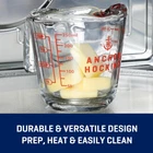 INCLUDES: This set contains (1) 5-oz glass measuring glass, (1) 1-cup glass measuring cup, (1) 2-cup glass measuring cup, and (1) 4-cup glass measuring cup. Anchor Hocking's signature spout facilitates clean pouring to reduce messes and ensure precise measurements. DURABLE AND VERSATILE USE: The larger measuring cups (1-cup, 2-cup, and 4-cup) are designed for melting, mixing, and reheating. Imperial and metric units sit side by side on sturdy, solid glass, ensuring you can whisk, beat, and pour in the same container COOK. STORE. CLEAN: The measuring cups are fridge, freezer, and dishwasher safe. Chip-resistant, nonporous glass protects food flavors. LEAD FREE. BPA FREE. SAFE DESIGN: Anchor Hocking glass is healthier than plastic and metal. It will not warp, stain, retain smells, or leach dangerous chemicals or microplastics into food or liquids 5-OUNCE MEASURING GLASS: The 5-oz measuring glass is non-tempered and NOT for microwave or freezer use. Always refer to the UPC label for usage instructions to avoid breakage. MADE IN USA: We began in Ohio in 1905 with the aim of maximizing your home’s potential. Today our goal and location are the same. That’s right. 115 years later, our glass measuring cups are still proudly Made in America Set contains: (1) 5-Oz measuring cup, (1) 1-cup glass measuring cup, (1) 2-cup glass measuring cup and (1) 4-cup glass measuring cup Anchor Glass measuring cups are tempered for maximum durability and feature an industry-leading 5 year warranty. Anchor Glass is a healthier choice over plastic; glass does not warp, stain, retain smells, or leach chemicals into food. Microwave, pre-heated oven, refrigerator and dishwasher safe. Anchor Glass is MADE IN THE USA.