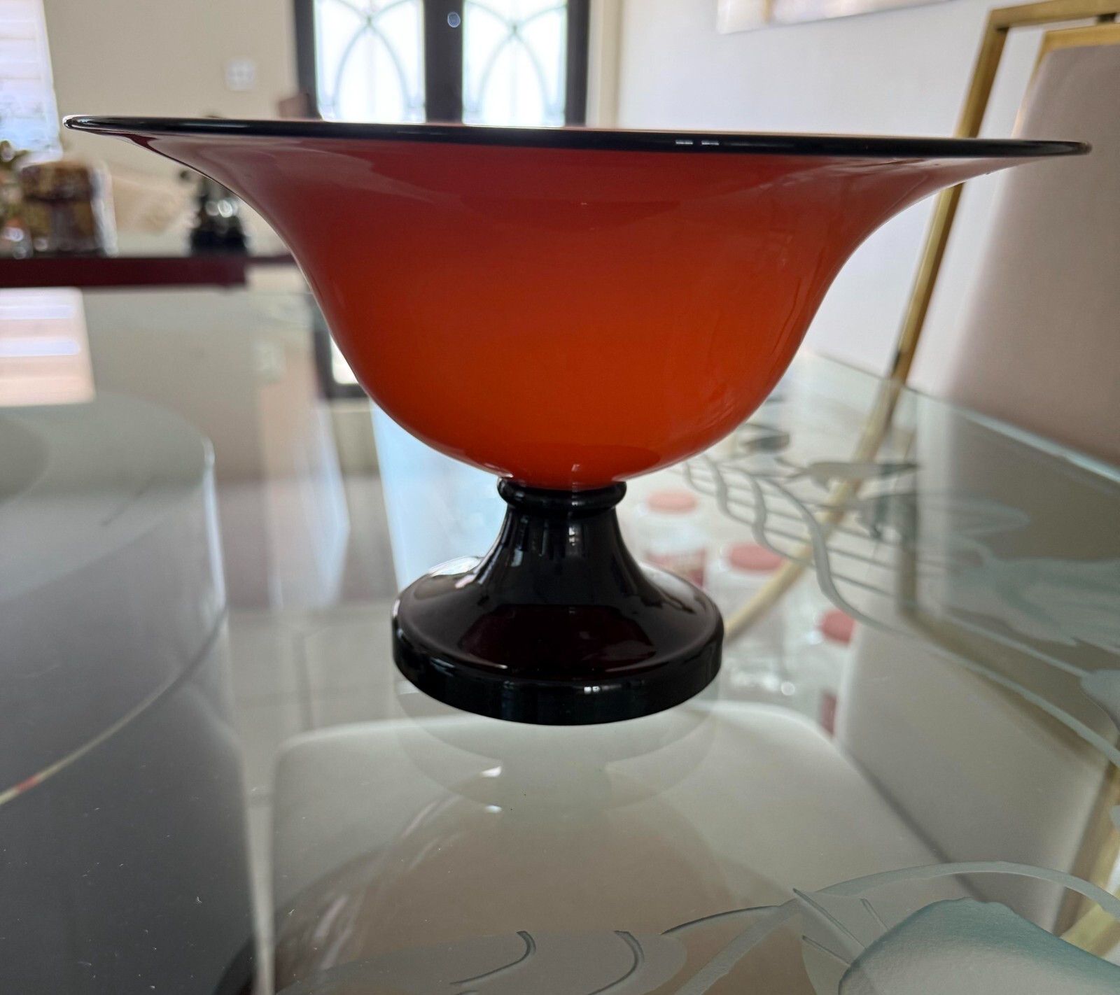 This stunning Art Deco bowl is a true showstopper! The vibrant orange glass with bold black accents makes it a striking centerpiece. The elegant pedestal base and generous 10-inch diameter give it a luxurious feel while staying practical. The craftsmanship from the 1920s shines through—you can see why Loetz glass remains collectible. Perfect for displaying fruit, decor, or just admiring as a standalone art piece. The colors pop beautifully in sunlight. A fantastic find for vintage glass lovers!