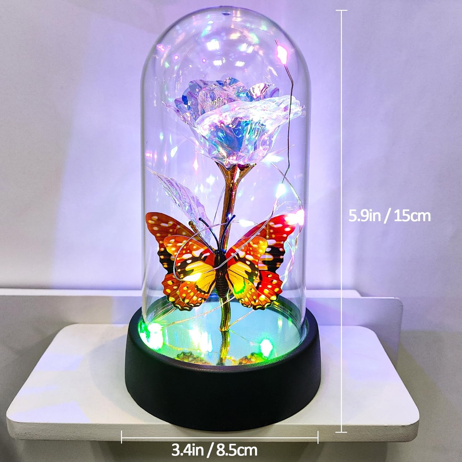 Free eBay listing template designed by dewiso.com Glass Rose in Glass Dome, Light Up Flower, Eternal Rose - Valentines Day Gifts for Her, Mothers Day Roses Gift for Mom, Womens Gifts for Christmas - Galaxy Rose, Birthday Gift FREE AND FAST SHIPPING! About this item 【Eternal Rose】Light up flowers, the never-fading glass roses, symbolize eternal love and beauty. The colorful roses are more like a rainbow, full of infinite hope. And galaxy rose will bring women infinite love and beauty, mothers day gifts for mom,mothers day gifts for wife,women,grandma,etc. Hurry up and create more surprises on the upcoming special day with this love-filled forever roses. Perfect mother's day gifts, mother's day gift ideas, mothers day gifts for mom from daughter 【Enchanting Design】Roses are protected by a tough glass dome, this guardianship is like a long-lasting companion of love, use this eternal flower as a gift for your favorite person and let forever roses continue to keep watch for you. Surrounded by a string of LED lights, the entire glass dome shines with warm multicolored lights, Rose flower it can be perfectly used as a decoration for bedrooms, living rooms, bookshelves, and tables to add sparkle to your life. Rose gifts for women 【Sweet Butterfly Flowers Rose Gifts for Mom Grandma Wife】Warm rose flower gifts for mom women grandma, womens gifts for christmas. Galaxy rose powered by 3 Alkaline Button Coin Cell power(Battery included), led lights are twined around rose, charming colorful light up in night, it adds a romantic and sweet atmosphere. Valentines day gifts for her, gifts for girlfriend, enchanted sparkly rose, light up rose in glass dome, glass rose in glass dome 【Best Women Gifts】The galaxy rose will came with a beautiful packaging box, so that you could give directly without spend time on package this mothers day,christmas,valentines day,birthday. Great romantic rose flower gift for her,women gifts for mother's day,mothers day gifts for mom,anniversary gifts for wife,womens gifts for christmas,birthday gifts for women,gifts for women 【Lasting Beauty】Keep the mothers day gifts from daughter indoors without management and can keep for 3-5 years. She will be happy to look at it and will feel that you are by her side all the time and it can be used as a small nightlight in bedroom to help sleeping. Perfect galaxy rose, forever rose, lighted flowers, rose of love Product We offer a 30-Day Return Policy on items which you are not completely satisfied with. You have the option for a full-refund or an exchange of the item. No returns are available on items shipped outside of the US . Shipping We offer Free Shipping to the US and ship within 2 business days of payment, usually sooner. We use UPS express shipping. That's why your products are usually delivered within 3 days . Contact We try our very best to make sure every customer is completely satisfied. If there's a problem , message us! We're happy to help. 24/7 live chat available.