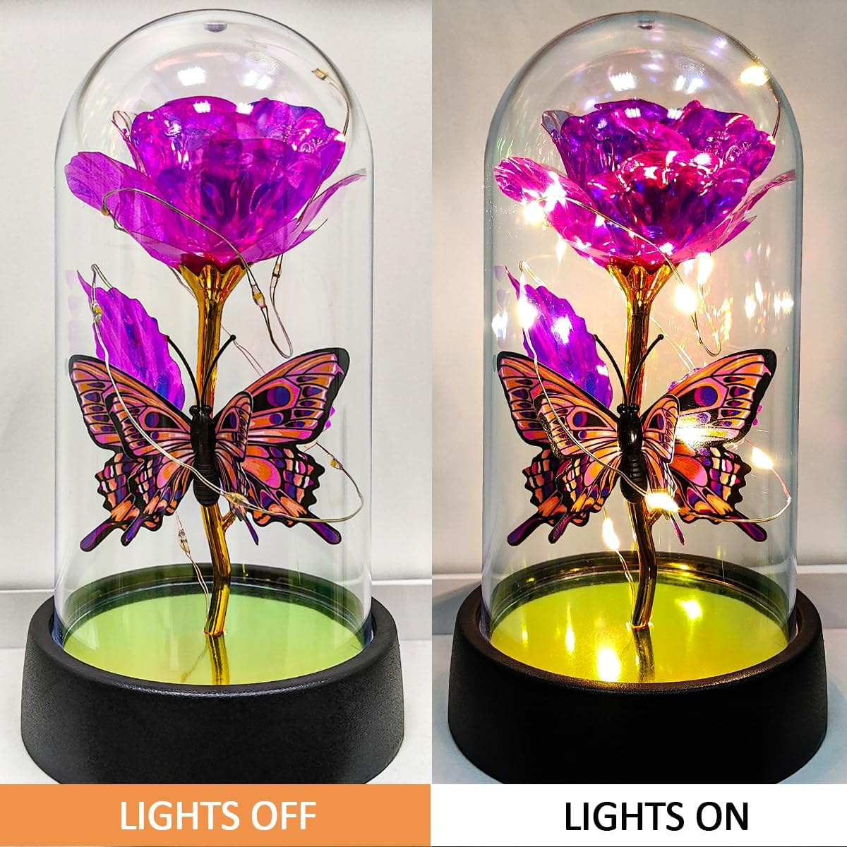 Fast Shipping On All Items 30 Days Money Guarantee Customer Support Excellent Service 100% Satisfaction Satisfaction Guaranteed Glass Rose in Glass Dome, Light Up Flower, Eternal Roses - Valentines Day Gifts Specification Item model number LR1130 Number of Items 1 Container Material Plastic Indoor/Outdoor Usage Indoor Unit Count 1.0 Count Room Type Bedroom, Dining Room, Living Room, Office Material Plastic Package Information Bottle Specific Uses For Product Gift, Home Decor Included Components Base, Glass Dome, Led Galaxy Rose Plant or Animal Product Type Rose Item Weight 4.2 ounces Seasons All Special Feature Battery Operated, Decorative, Glass Dome Protection, Light Up Rose, Long Lasting Color Butterfly Rose Warming Lamp Container Shape Dome Shape Round Recommended Uses For Product Anniversary, Christmas Gifts, Gift Giving, Home Decor, Mothers Day, Special Occasions Scent Unscented Product Dimensions 3.4"D x 3.4"W x 5.9"H 3.4 "h x 3.4 "h x 5.9 "h. Weight: 4.2 oz Item Description 【Eternal Rose】Light up flowers, the never-fading glass roses, symbolize eternal love and beauty. The colorful roses are more like a rainbow, full of infinite hope. And galaxy rose will bring women infinite love and beauty, mothers day gifts for mom,mothers day gifts for wife,women,grandma,etc. Hurry up and create more surprises on the upcoming special day with this love-filled forever roses. Perfect mother's day gifts, mother's day gift ideas, mothers day gifts for mom from daughter 【Enchanting Design】Roses are protected by a tough glass dome, this guardianship is like a long-lasting companion of love, use this eternal flower as a gift for your favorite person and let forever roses continue to keep watch for you. Surrounded by a string of LED lights, the entire glass dome shines with warm multicolored lights, Rose flower it can be perfectly used as a decoration for bedrooms, living rooms, bookshelves, and tables to add sparkle to your life. Rose gifts for women 【Sweet Butterfly Flowers Rose Gifts for Mom Grandma Wife】Warm rose flower gifts for mom women grandma, womens gifts for christmas. Galaxy rose powered by 3 Alkaline Button Coin Cell power(Battery included), led lights are twined around rose, charming colorful light up in night, it adds a romantic and sweet atmosphere. Valentines day gifts for her, gifts for girlfriend, enchanted sparkly rose, light up rose in glass dome, glass rose in glass dome 【Best Women Gifts】The galaxy rose will came with a beautiful packaging box, so that you could give directly without spend time on package this mothers day,christmas,valentines day,birthday. Great romantic rose flower gift for her,women gifts for mother's day,mothers day gifts for mom,anniversary gifts for wife,womens gifts for christmas,birthday gifts for women,gifts for women 【Lasting Beauty】Keep the mothers day gifts from daughter indoors without management and can keep for 3-5 years. She will be happy to look at it and will feel that you are by her side all the time and it can be used as a small nightlight in bedroom to help sleeping. Perfect galaxy rose, forever rose, lighted flowers, rose of love Transform any space into a magical wonderland with this enchanting Galaxy Rose in Glass Dome from YXOTJHS. This exquisite artificial flower creates a mesmerizing display that combines the timeless beauty of a rose with modern illumination. The delicate rose is carefully crafted and suspended within a clear glass dome, creating an elegant presentation that catches the eye whether displayed on a desk, shelf, or bedside table. When activated, the built-in lights create a stunning galaxy-like effect that bathes the rose in a ethereal glow, making it a perfect centerpiece for romantic occasions or everyday decor. As a forever rose, it offers lasting beauty that won't wilt or fade, making it an ideal gift for special occasions, Valentine's Day, Mothers Day, Christmas, anniversaries, or any time you want to show someone they're truly special. The combination of classic romance and modern lighting technology makes this enchanted rose a unique conversation piece that will be treasured for years to come. About us We offer the best prices around on high quality products. Our E-store includes media such as books, movies, music and games while offering electronics, toys, sporting apparel, clothing, tools, general home, garden items and more. Shipping We are always working hard to ensure your package arrives as soon as possible. Please understand that some factors like weather, high postal traffic, and the performance of shipping companies are outside of our control. We offer free shipping to the lower 48 states and ship within 2-3 business days of payment, usually sooner. We do not accept P.O. Boxes. Please provide a physical address. For shipping outside of the continental USA, we only use eBay's Global Shipping Program.The item is shipped to KY and then sent to the rest of the world. International customers are responsible for all duties and taxes. Continue to check out to calculate costs for shipping the item to your country. Messages regarding eBay's Global Shipping Program MUST be directed at eBay EXCLUSIVELY. Returns We offer a 30-Day Return Policy on items in which you are not completely satisfied with. You have the option of a full-refund or an exchange of the item. No returns are available on items shipped outside of the USA Satisfaction We try over very best to make sure every customer is completely satisfied. If there's a problem, message us! We're happy to help. Payment Options Shop With Confidence