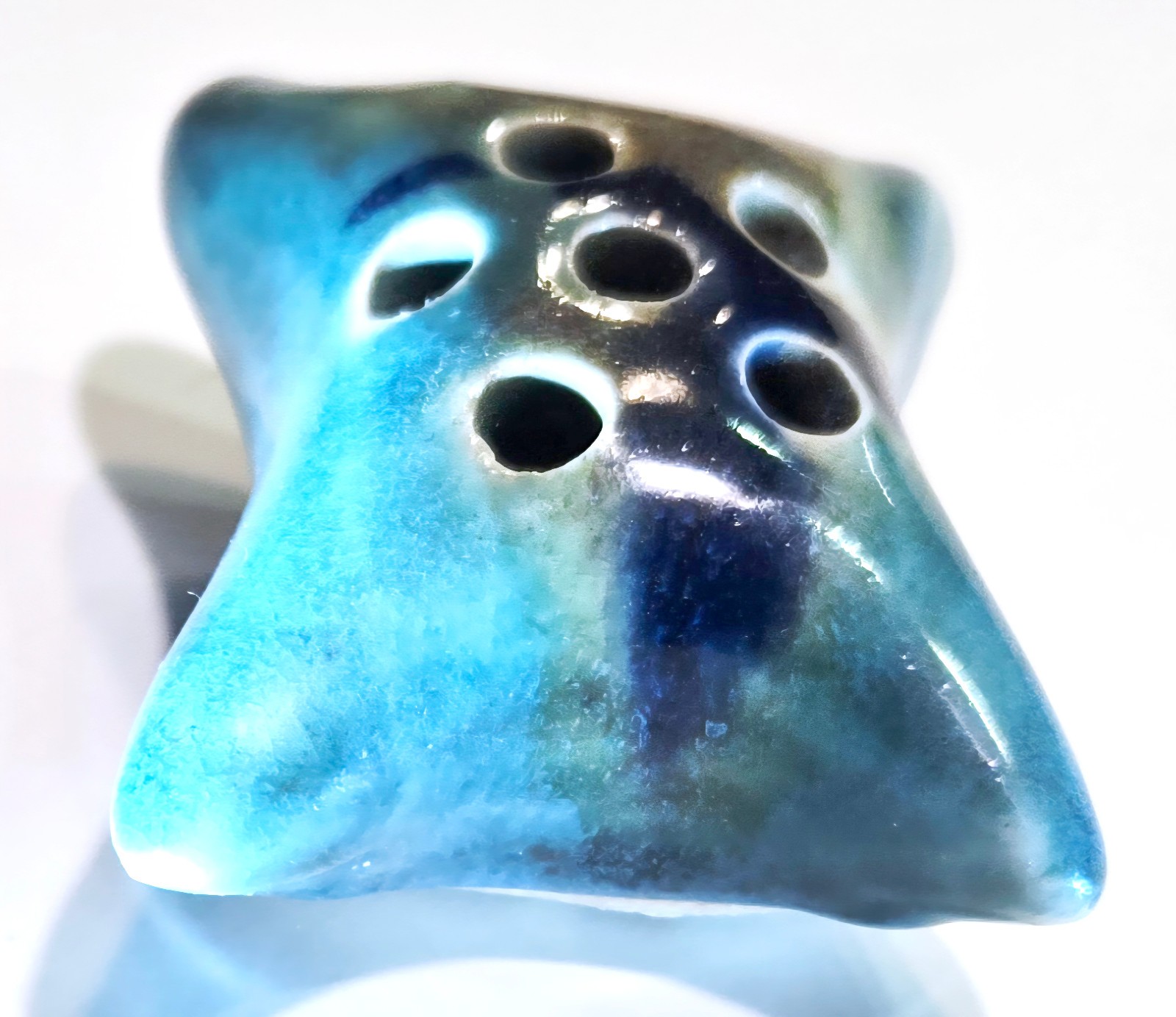 Glazed Pottery Pillow-Shaped Vase Frog Pillow Vase 3”X 2.25” Turquoise w/ Dark Blue + Rust Artisan-made, slight crackle glaze on top with unglazed bottom. Light use, clean, like new condition. Great for displaying small flowers on a kitchen window or next to you at your desk. Enjoy the tender gift of flowers from your child or loved one. Small holes (frog) help hold flowers upright.