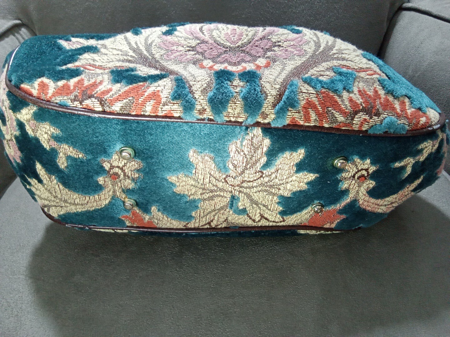 This Glenda Gies Frame Bag is a stylish and elegant evening purse with a unique Aqua/Gold Chenille Tapestry design. The trapezoid shape and kiss lock closure add a touch of sophistication, making it suitable for parties, cocktail events, or formal occasions. The medium-sized bag features a brown faux leather top handle with a 5.5" drop, complemented by gold hardware accents. Lined with brown fabric, the bag also includes bottom studs for protection and is lightweight for easy carrying. Perfect for those looking to make a designer statement with a touch of vintage charm.