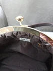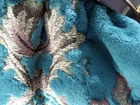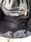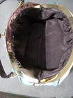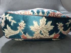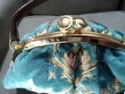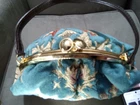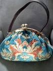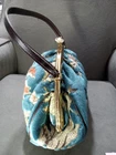 This Glenda Gies Frame Bag is a stylish and elegant evening purse with a unique Aqua/Gold Chenille Tapestry design. The trapezoid shape and kiss lock closure add a touch of sophistication, making it suitable for parties, cocktail events, or formal occasions. The medium-sized bag features a brown faux leather top handle with a 5.5" drop, complemented by gold hardware accents. Lined with brown fabric, the bag also includes bottom studs for protection and is lightweight for easy carrying. Perfect for those looking to make a designer statement with a touch of vintage charm.