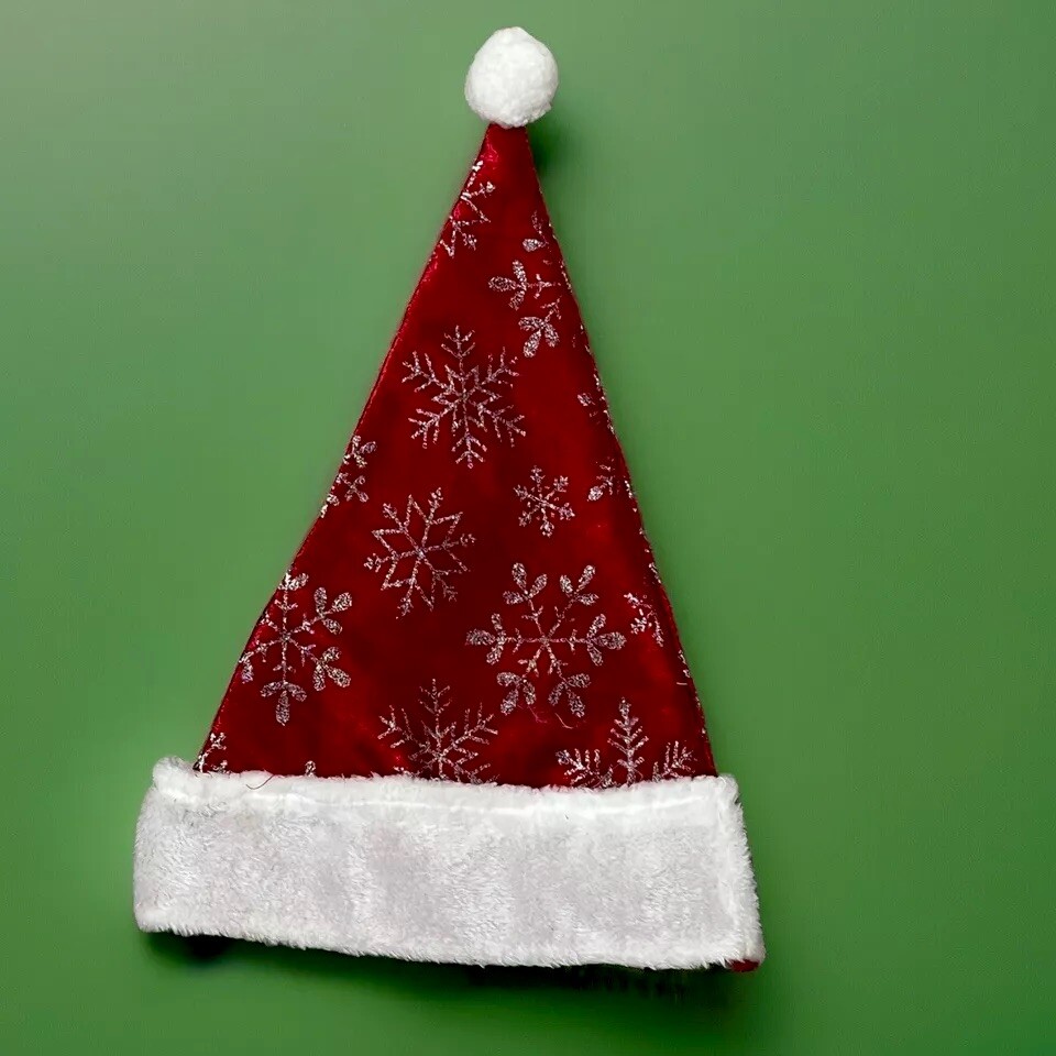 Christmas Santa Hat Adults Glitter Snowflakes Plush Velvet Red White Brim Pom Pom Total Length 17 Brim Width Flat 11.5 inches