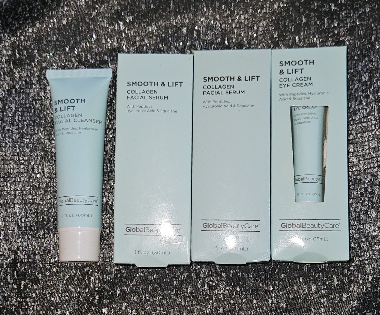 Global Beauty Care Smooth + Lift Cleanser, Eye Cream, + 2 Serums BNIB. ☆(2) Global Beauty Care Smooth + Lift Collagen Facial Serum 1fl oz •With peptides, hyaluronic acid, collagen, & Squalane •Contains luxurious, concentrated ingredients to reboot skin health, moisturize, and recharge for smoother looking skin. ☆Global Beauty Care Smooth + Lift Collagen Facial Cleanser 2fl oz •With peptides, hyaluronic acid, collagen, and Squalane ☆Global Beauty Care Smooth + Lift Collagen Eye Cream 0.5fl oz •With peptides, Hyaluronic Acid, Collagen, and Squalane. BNIB #globalbeautycare #skincare #smoothandlift #cleanser #facialserum #eyecream #skincarebundle #peptides #Collagen #Hyaluronicacid #Squalane #antiaging #Bundle
