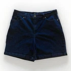 Gloria Vanderbilt Amanda All-Around Slimming Effect Stretch Dark Denim Shorts in size 16. With a solid dark wash and slim fit, these shorts feature a zip closure, flat front, and a high-rise waist for added slimming effect. Made from a cotton blend denim fabric, these shorts are machine washable and perfect for the summer, fall, or spring seasons. The Bermuda style with a 5-pocket design, 5-inch inseam, and 12-inch rise make these shorts a staple piece for your wardrobe. No stains, tears, or rips. Zip and button closure is fully functional. 12” rise 5” inseam 34” waist 17” total length