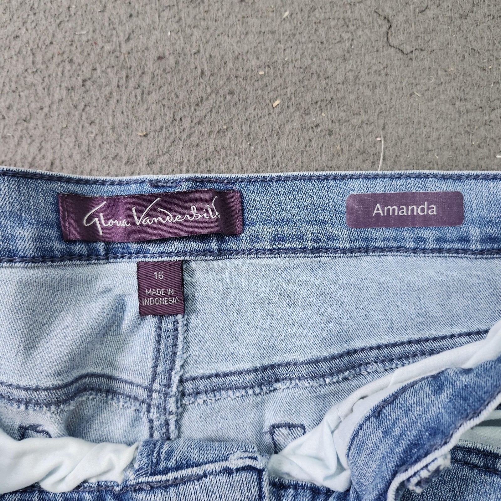 Brand: Gloria Vanderbilt Style: Womens Amanda high-rise straight leg jeans designed for classic everyday wear. Color: Light wash blue denim with soft overall fading for a gently worn, broken-in look. Size: Womens 16 as indicated on the interior waistband size tag. Materials: Traditional denim fabric with tonal stitching; exact fiber content is not fully visible on the available tags. Design details: Zip fly with metal button closure, belt loops around the waistband, and a five-pocket layout including two front scoop pockets, a small coin pocket, and two back patch pockets. Features: High-rise waist for added coverage and comfort, straight leg from knee to hem for a relaxed classic fit, and light wash denim that pairs easily with tees, sweaters, or blouses across all seasons. Additional info: Interior labels show Gloria Vanderbilt branding, style name "Amanda," size 16, and Made in Indonesia; modern non-vintage style from the Gloria Vanderbilt Amanda product line. Flaws: Pre-owned jeans with light general wear and gentle wash fading to the light denim; fabric, seams, zipper, pockets, and hems are clean and intact without stains, holes, or fraying.