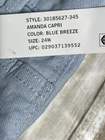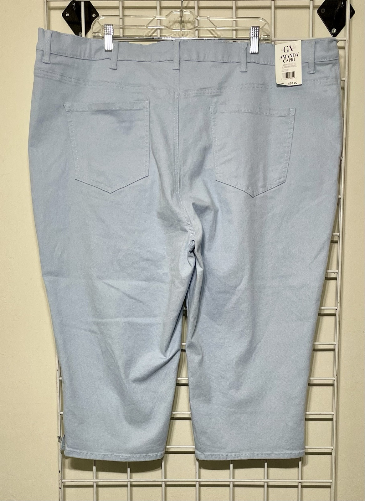This product is a pair of Gloria Vanderbilt Capri jeans in a size 24W with a light blue color called Blue Breeze. The jeans feature a stretchy material blend of cotton, polyester, and spandex for comfort and flexibility. They have a Capri leg style, a zip and button closure, and are brand new with tags. The design is part of the Amanda collection, making them a stylish and trendy choice for women's casual wear.