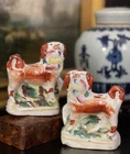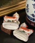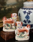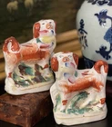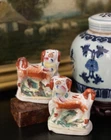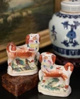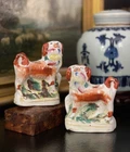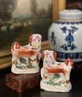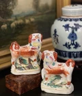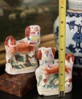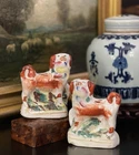 Marvelous Rare Petite Pair 19C English Staffordshire Mantle Spaniel Mantle Hunt Dogs with Game • Russet Spaniels with Polychromatic Game Birds • Timeless Original Antique Example • Height 4” • Length 3.25” • Width 1.5” I am delighted to bring you this stunning rare 19C pair of spaniel bird dogs with colorful game and coat markings featuring beautifully executed rarely seen characteristic brushwork technique in brilliant colours. Quite gorgeous. An extremely scarce original pair of right and left facing petite English country life mantle figures in classic form. Impressive showpieces to enjoy on their own or as part of a collection or arrangement. Excellent expected antique period condition with time softened patina. To be displayed unapologetically as an authentic example from Victorian era England. No chips. Typical characteristic manufacturing anomalies such as factory original under-glaze firing cracks, rough patches and moulding imperfections all underglaze in places. These are period appropriate and serve as valuable clues that determine age and authenticity and are not considered to be flaws. Stunning surviving gallery quality examples to own and treasure. Scarce. Display ready.