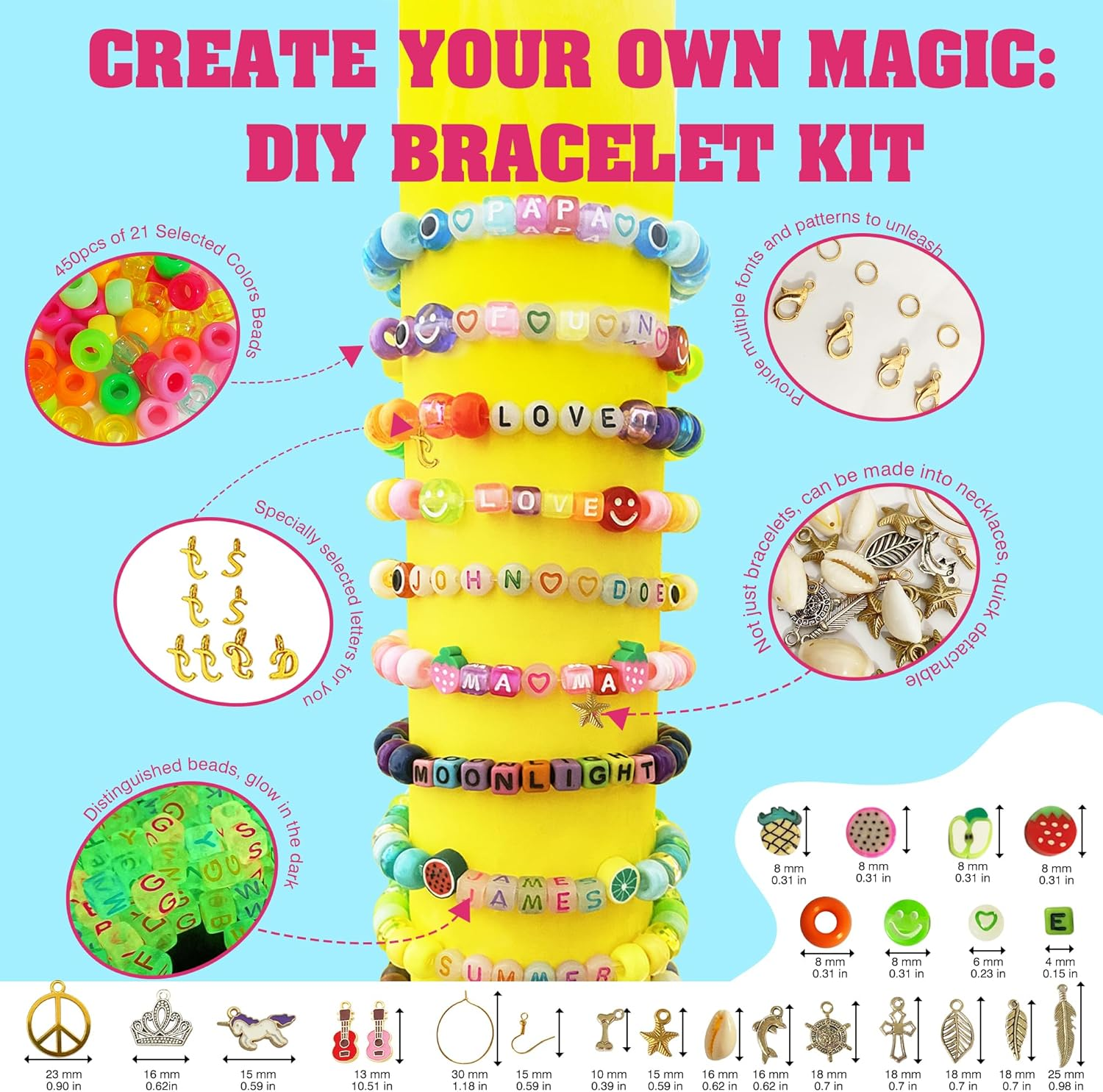 Comprehensive Bead Collection for Endless Creativity: Explore your creativity with a diverse assortment of beads in this Dupamind DIY kit. Featuring 1800 pieces of 9mm colorful pony beads, 600 pieces of glow-in-the-dark beads, and 400 pieces of specialty beads including letter beads, fruit beads, eye beads, smiley face beads, pendants, lobster clasps, and more—every component shown in the image is included. This extensive variety allows for limitless design possibilities. Glow-in-the-Dark Magic: Illuminate your creations with the unique glow-in-the-dark beads included in this Dupamind set. Perfect for adding a mystical touch to your jewelry, these beads emit a soft, captivating glow in dark environments, making your handmade pieces stand out no matter the setting. Durable, High-Quality Materials: Craft with confidence knowing your jewelry is made to last. Our pony beads, glow-in-the-dark beads and accessories are crafted from top-notch materials, ensuring your DIY creations are comfortable to wear, resistant to fading, and waterproof. Whether you're at the beach, by the pool, or in the shower, your jewelry will remain as vibrant as ever. All-Inclusive Crafting Tools: This Dupamind kit includes everything you need to start crafting right away. With easy-to-use tools and a wide array of colorful and stylish components, you can effortlessly design and create unique bracelets and necklaces that reflect your personal style. A Perfect Gift for Creative Fun: This Dupamind DIY bracelet kit is an excellent way to engage with children and encourage creativity. It’s ideal for family activities, providing a screen-free, hands-on experience that fosters imagination. Whether as a birthday gift, party favor, or friendship bracelet, this kit is a delightful present for kids, family, friends, or yourself. Product Description