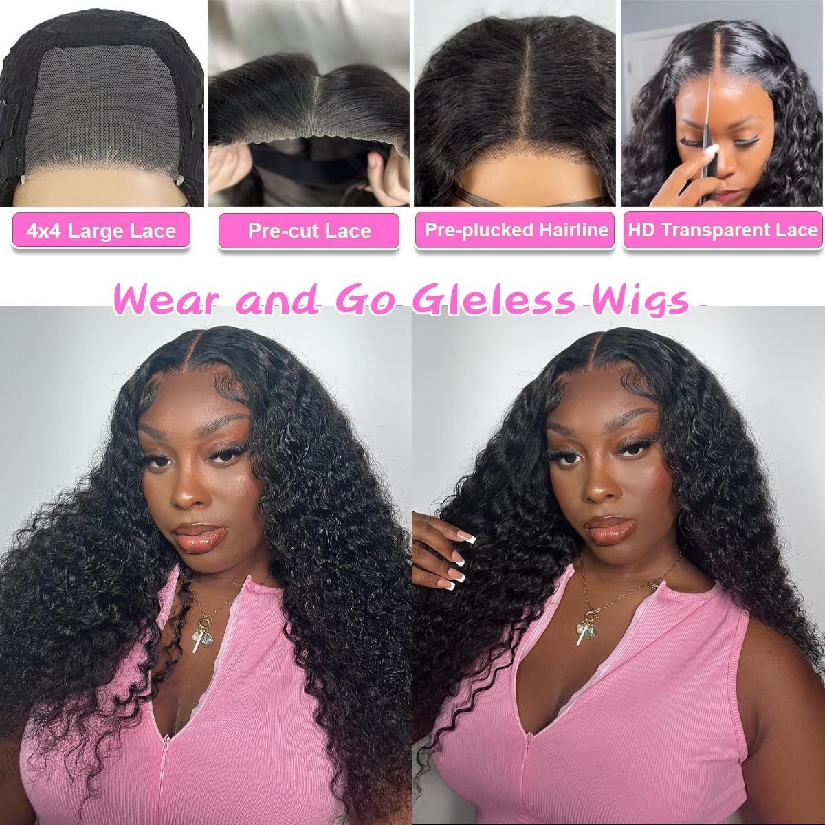 【Black Ready-To-Wear Glueless Wigs Material】Glueless Wig Human Hair,Donated By Brazilian Teenage Girls. Very Soft And Smooth, Won'T Fall Off. Extra Large Lace Area Can Be Designed According To Your Preference For Different Looks. Natural Black Color Is Suitable For All Women 【Glueless CurlyWear And Go Glueless Wig Detail】Breathable Transparent 4x4 Hd Lace Material That Perfectly Blends With Your Skin, With A Pre Plucked Pre Cut Design That Keeps The Edges Clean And Sturdy. 【Glueless Wigs Human Hair Pre Plucked Pre Cut Advantages】 3 Seconds Install Glueless Wigs!No Skill Required, Just Wear&Go! Save Your Time, Beginner Friendly. Glueless Straight Lace Human Hair Wig Pre Cut Pre Plucked Natural Hairline. No Glue, No Gel, Protect You Skin 【Eool C-Shape Ear Design 3d Dome Cap Cap】The Black Glueless CurlyHair Wig Features A 21.5-22.5 Inch Medium-Sized 3d Breathable Cap, Meticulously Measured To Snugly Fit Your Head With Its Specially Designed Arch. Hat With Non-Slip Elastic Band And Does Includes 4 Small Combs, Making It Suitable For All Head Sizes While Ensuring Breathability And Comfort. Additionally, The Removable And Adjustable Elastic Band Allows The Scalp To Breathe Freely And Securely Holds The Wig In Place 【4x4 Curly Lace Front Wig Human Hair Suitable For Any Occasion】Glueless Wig Human Hair Suitable For Parties, Birthdays, Travel, Celebrations, Back To School And Daily Life. It Also Can Give It To Family And Friends In Christmas, New Year And Birthday. Make You More Confident And Attractive