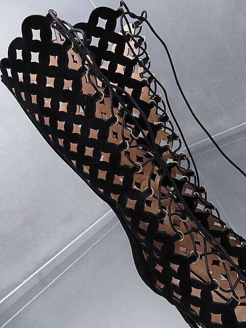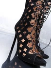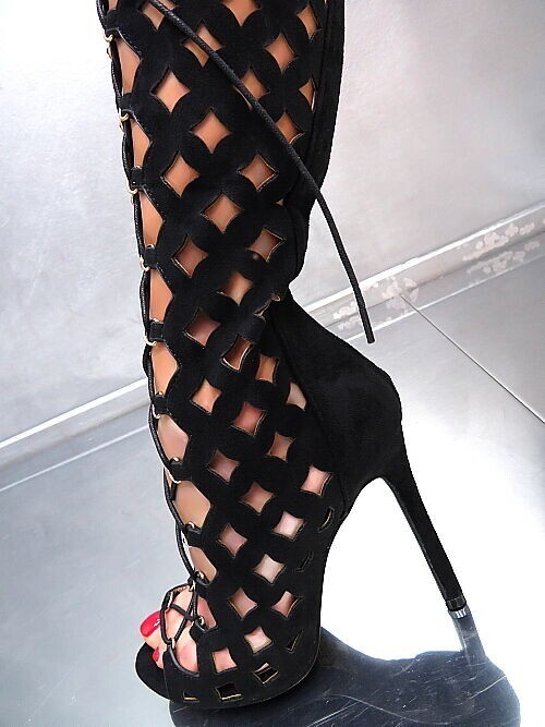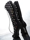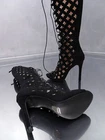 Original GoGo high heels boots. Featuring: knee high, see through, corset in the front, back zipper closure, round open toe, stiletto heels, always trendy color, branded insole, black sole. Designed in Italy specifically for high fashion Italian market. Elegant and comfortable.